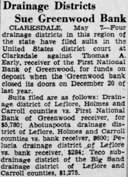 Drainage Districts Sue Bank May districts this region of the state have filed suits in the United States district court Clarksdale against Thomas Early, First National Bank Greenwood, for funds on deposit when the Greenwood bank closed its doors on December 20 of year. Suits filed as follows: Drainare district Leflore, Carroll VS. First National Bank Greenwood receiver, Abotuapoota drainage trict Leflore, Holmes Carroll counties bank receiver, lucia drainage district Leflore bank receiver, $284; Teco subdistrict the Big Sand drainage drainage district Leflore Carroll counties, $1,275.