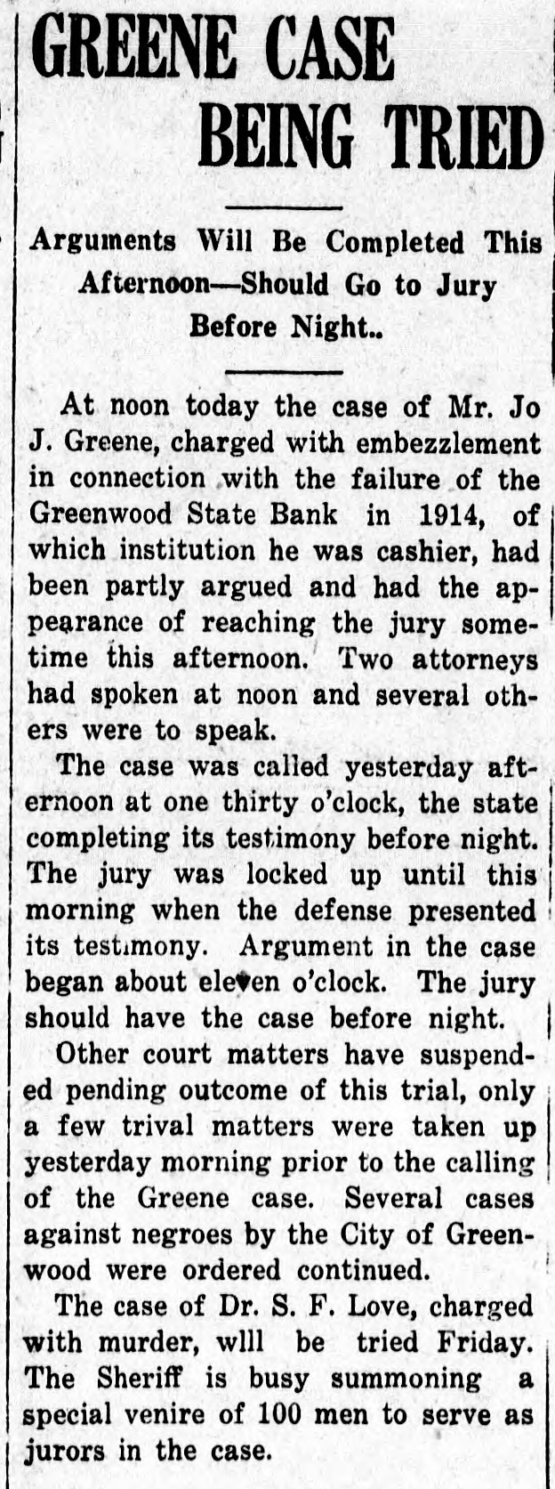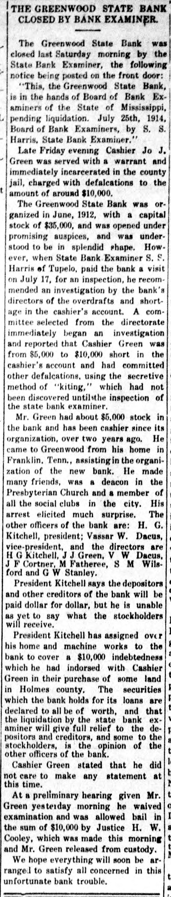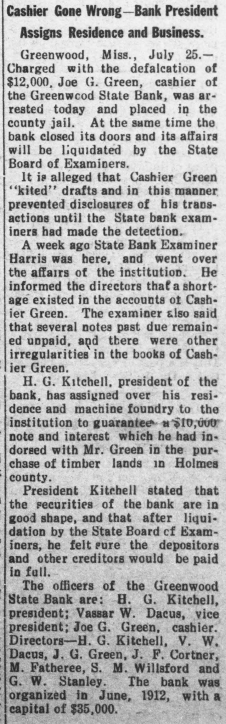 Cashier Gone Wrong-Bank President Assigns Residence and Business. Greenwood, Miss., July 25.Charged with the defalcation of $12,000. Joe G. Green, cashier of the Greenwood State Bank, was arrested today and placed in the county jail. At the same time the bank closed its doors and its affairs will be liquidated by the State Board of Examiners. It is alleged that Cashier Green "kited" drafts and in this manner prevented disclosures of his traosactions until the State bank examiners had made the detection. A week ago State Bank Examiner Harris was here, and went over the affairs of the institution. He informed the directors that a shortage existed in the accounts of Cashier Green. The examiner also said that several notes past due remained unpaid, and there were other irregularities in the books of Cashier Green. H. G. Kitchell, president of the bank, has assigned over his residence and machine foundry to the institution to guarantee a $10,000 note and interest which he had indorsed with Mr. Green in the purchase of timber lands in Holmes county. President Kitchell stated that the securities of the bank are in good shape, and that after liquidation by the State Board cf Examiners, he felt sure the depositors and other creditors would be paid in full. The officers of the Greenwood State Bank are: H. G. Kitchell, president; Vassar W. Dacus, vice president; Joe G. Green, cashier. Directors-H. G. Kitchell, V. W. Dacus, J. G. Green, J. F. Cortner, M. Fatheree, S. M. Willsford and G. W. Stanley. The bank was organized in June, 1912, with a capital of $35,000.