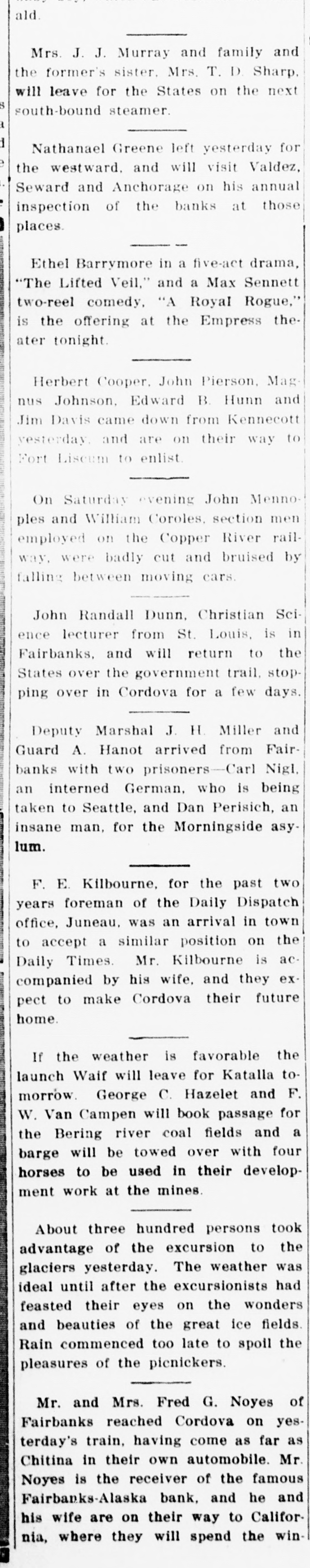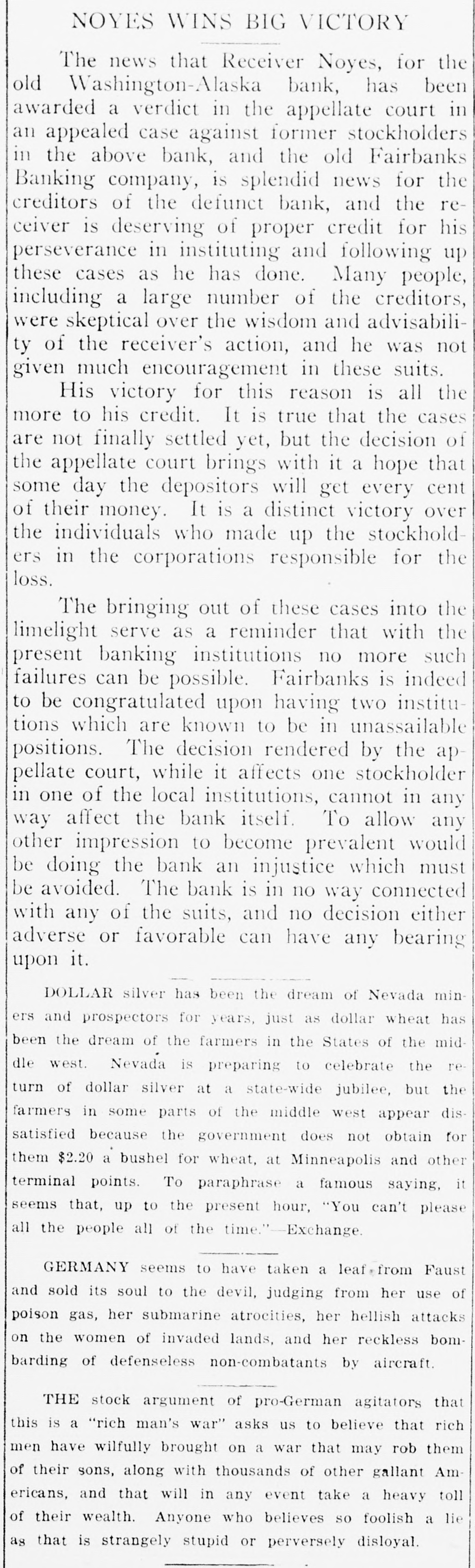 APPEAL OF RECEIVER IN ONE OF THE BANK CASES DENIED The consideration is declared to have SAN FRANCISCO, Sept. 4. (Spe been $250,000. eial wire of The Associated Press) The United States circuit court of The lower court held that the Fairappeals today denied the appeal of banks Banking company failed be F. G. Noyes, receiver of the Washcause of poor management and that ington-Alaska Bank of Fairbanks, Althe plaintiff corporation, or the Washaska, for a million eight hundred ington-Alaska bank through its reand sixty-eight thousand dollars exceiver. being part of the alleged ilemplary and compensatory damages legal combine, could not sue under as the result of the alleged combi the Sherman anti-trust act. The denation of the Washington-Alaska murrer of the defense stating these Bank, the First National Bank of facts was sustained, but Noyes claimFairbanks and the Fairbanks Bank ed that it was in error. ing company. According to Noyes, the liabilities of the Fairbanks Banking company The suit was aimed against the diat the time of the sale exceeded the rectors and stockholders of the Fairassets by $535,000. The original banks Banking company and was in complaint outlined secret agreements stituted in the Northern Federal Jubetween the directors of the three dicial district of the State of Washbanks to market all the gold output, ington. Noyes contended in the preexchange and regular banking busi liminary sult that the three banks ness in an undefined region extendoriginally controlled all of the bank ing for hundreds of miles around ing business in the vast district Fairbanks. around Fairbanks and in the TanThe defendants in the original suit ana Valley through a non-competitive were W. H. Parsons, Falcon Joslin, agreement. The complaint in the John Schram, E. L. Webster, J. W. proceedings further alleged that the Clise, F. E. Barbour and their reWashington-Alaska bank and the spective wives and Washington se Fairbanks Banking company subsecurities. quently took over the interests of the First National bank and, at a Interviewed last night concerning later period, the Fairbanks Bank the foregoing dispatch, which is printing company took over the interests ed practically verbatim, Mr. Noyes of the Washington-Alaska concern. stated that it refers to a demurrer This was done, the complaint alto his complaint sustained by the leged, in the pursuance of a conjudge of the court in Seattle, on spiracy in restraint of trade. statute of limitation grounds, and it The complaint further alleged that means that the decision of the lower at the time that the Fairbanks Bank court in regard to the demurrer has ing company purchased the Washbeen sustained by the court of apington-Alaska bank, the former instipeals. It has but little bearing on tution was insolvent and that it obthe main Washington-Alaska bank ligated itself to meet the purchase case, as far as can be ascertained. price out of the depositors' money inScratch pads for sale at The Citi stead of from the usual reserve fund demanded by law for such purposes. zen office.