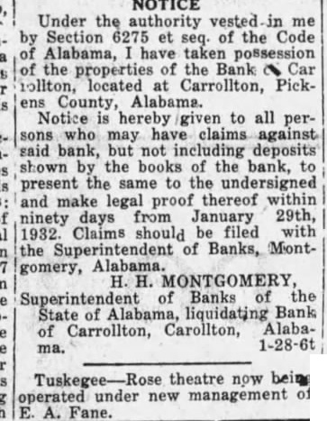 NOTICE Under the authority vested me Section 6275 et seq. of the Code Alabama, have taken possession the properties of the Bank Car rollton, located at Carrollton, Pickens County, Alabama. Notice hereby given to all persons who have claims against said bank, but not including deposits shown by the books of the bank, to present the same to the and make legal proof thereof within ninety days from January 29th, 1932. Claims should filed with the of Banks, Montgomery, Alabama. MONTGOMERY of Banks of the State of Alabama, liquidating Bank of Carrollton, Carollton, Alabama. theatre now being operated under new management Fane.