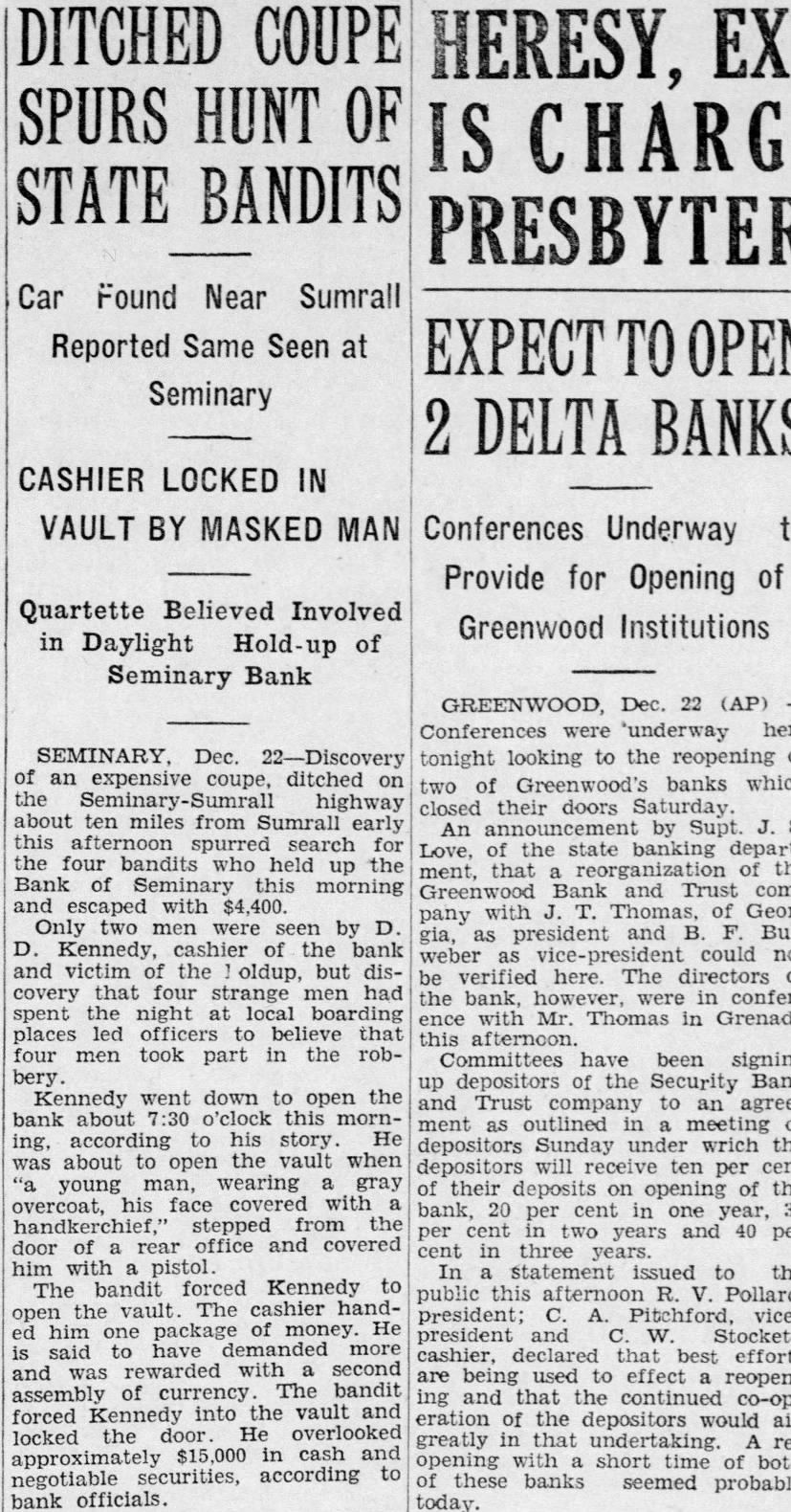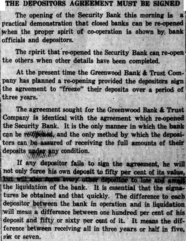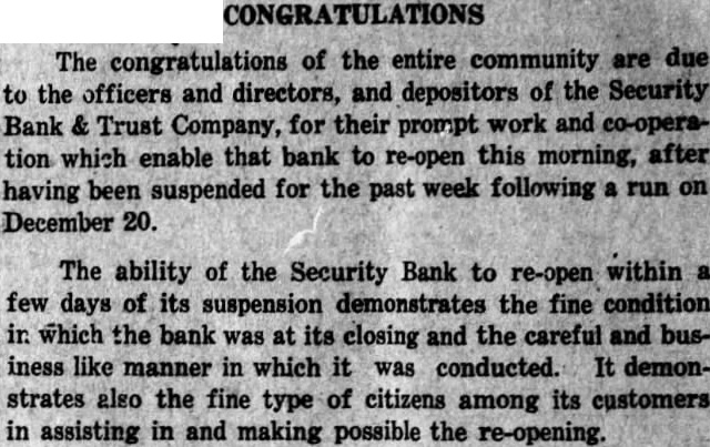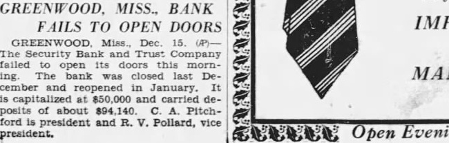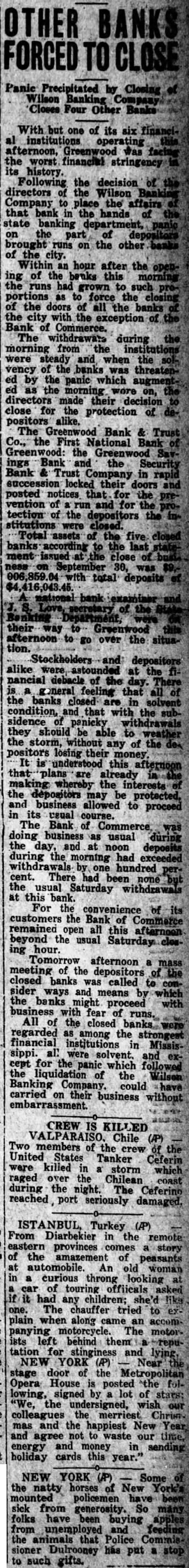 OTHER Panic Precipitated Wilson Banking Closes Four Other With but one of its six financiinstitutions afternoon, the worst stringency history. Following the decision directors Wilson Company place the that the hands state banking department, on part brought runs on the other of the city. Within an hour after the of the banks this had grown to such portions as force the the doors of all the banks the city with the exception of Bank of Commerce. The during the morning from the were steady when the vency of banks was threatenthe panic which augmentdirectors made their close for the protection positors alike. The Bank the First National Bank the ings Bank and the Security Bank & Trust in locked their and posted notices for the vention and for the tection of the the stitutions Total assets of the five closed banks the ment close 30, with total deposits national bank Department, their way afternoon over the situa- Stockholders alike debacle of the general feeling banks solvent condition, and that with the sidence panicky should able weather the without any of the losing their money understood this already making whereby interests depositors may business allowed to proceed its usual course. The Bank Commerce doing business usual the day, and noon deposits during the morning had exceeded hundred cent. There had been the usual Saturday withdrawals at this bank. For convenience customers the Bank of Commerce remained open all this beyond the usual Saturday ing hour. Tomorrow afternoon meeting of the depositors closed banks was called sider ways and means the banks might proceed business with fear All the closed regarded among the financial institutions Mississippi. all were solvent. for the panic followed liquidation Banking could carried their business without embarrassment. CREW IS Chile Two United members of the crew States Tanker Ceferin were killed storm raged over the Chilean during night. The Ceferino reached port seriously damaged, Turkey (AP) From Diarbekier the remote eastern provinces comes the amazement of automobile An old curious throng looking touring asked had any children; The chauffer tried plain when along came accompanying left behind them tation for and NEW YORK (AP) stage door the Opera House posted lowing, signed by of stars: undersigned, colleagues merriest Christmas and the happiest New agree not waste energy money sending holiday cards this NEW YORK Some the natty horses of New York's mounted policemen sick from generosity. folks have been buying from unemployed and the animals that Police Dulrooney has put such gifts.