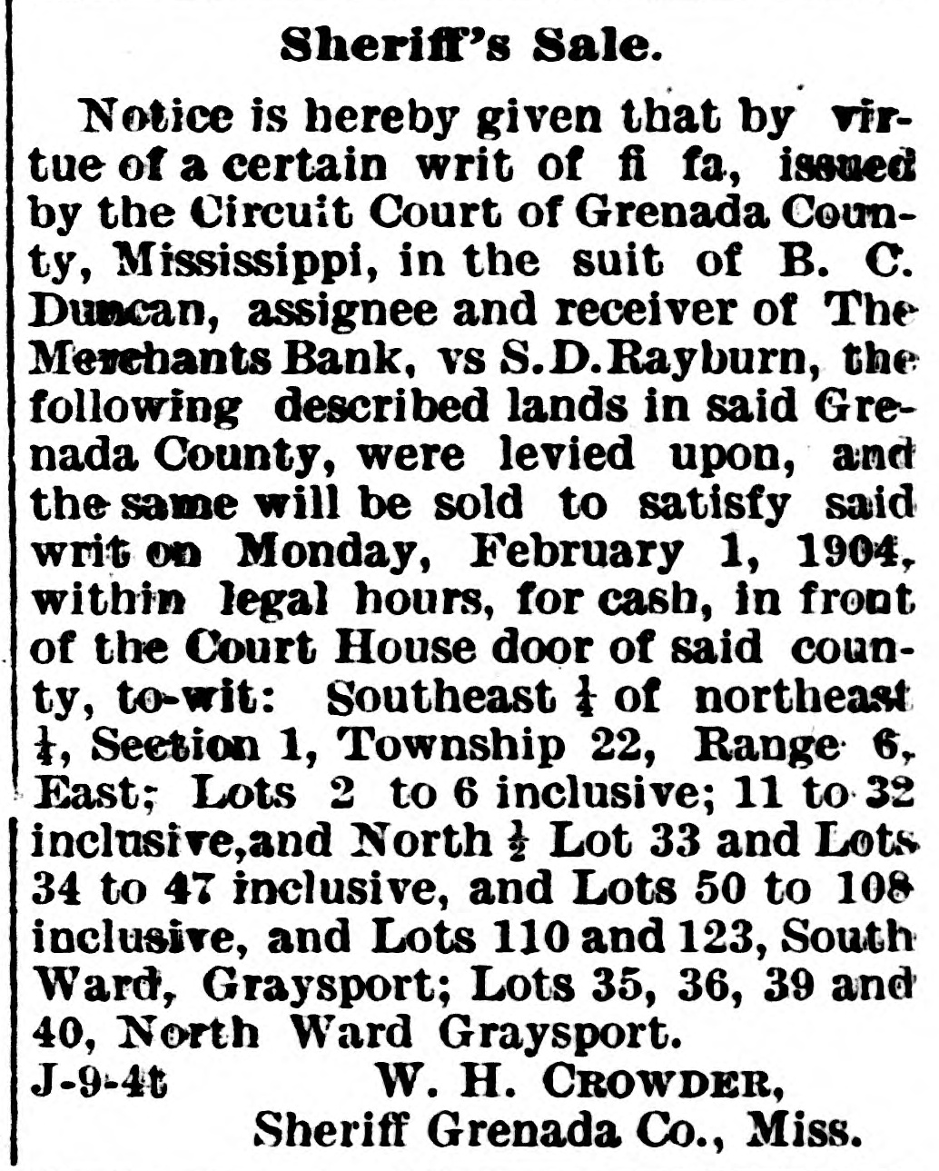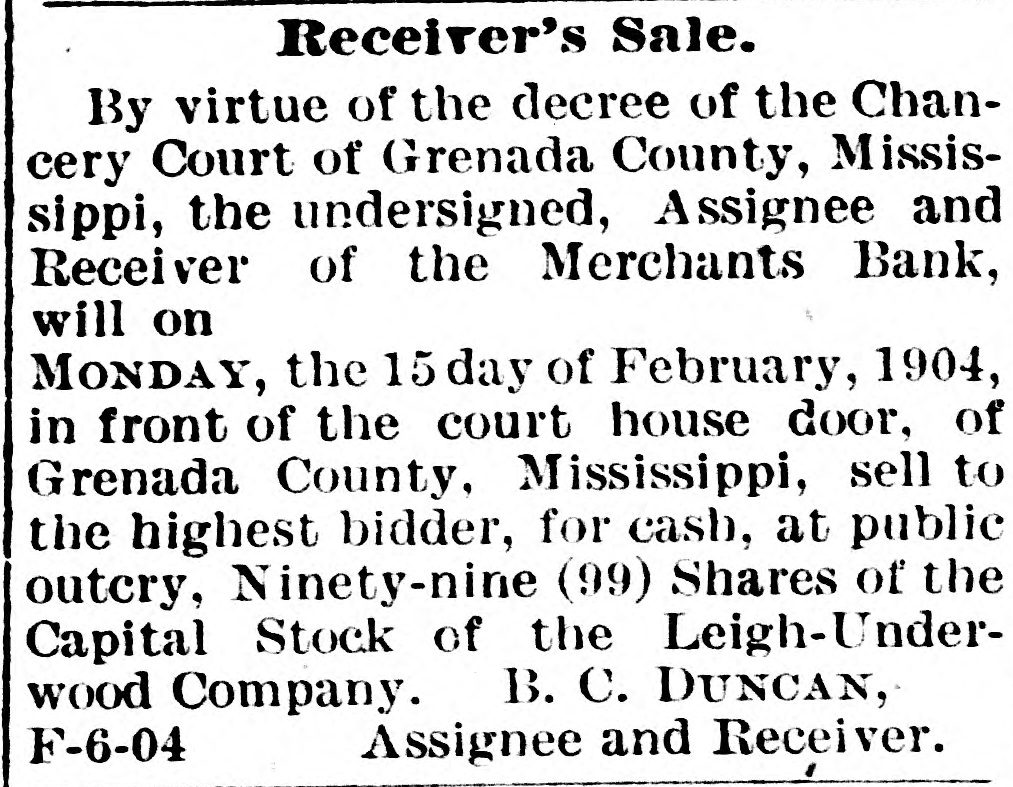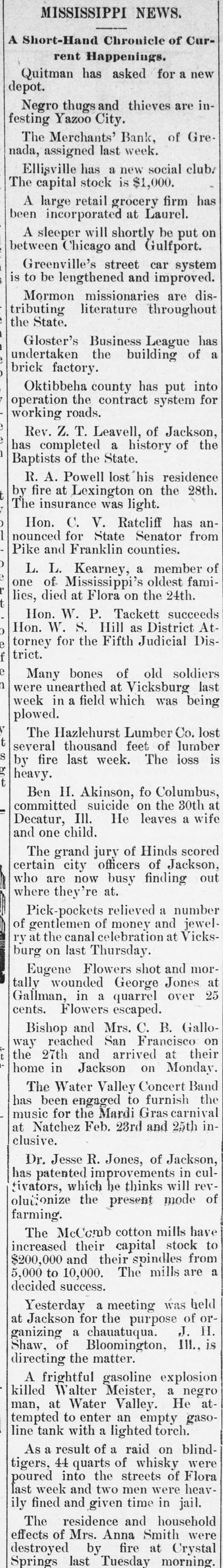 MISSISSIPPI NEWS. A Short-Hand Chronicle of Current Happenings. Quitman has asked for a new depot. Negro thugs and thieves are infesting Yazoo City. The Merchants' Bank, of Grenada, assigned last week. Ellisville has a new social club. The capital stock is $1,000. A large retail grocery firm has been incorporated at Laurel. A sleeper will shortly be put on between Chicago and Gulfport. Greenville's street car system is to be lengthened and improved. Mormon missionaries are distributing literature throughout the State. Gloster's Business League has undertaken the building of a brick factory. Oktibbeha county has put into operation the contract system for working roads. Rev. Z. T. Leavell, of Jackson, has completed a history of the Baptists of the State. R. A. Powell lost his residenee by fire at Lexington on the 28th. The insurance was light. Hon. C. V. Ratcliff has announced for State Senator from Pike and Franklin counties. L. L. Kearney, a member of one of Mississippi's oldest families, died at Flora on the 24th. Hon. W. P. Tackett succeeds Hon. W. S. Hill as District Attorney for the Fifth Judicial District. Many bones of old soldiers were unearthed at Vicksburg last week in a field which was being plowed. The Hazlehurst Lumber Co. lost several thousand feet of lumber by fire last week. The loss is heavy. Ben H. Akinson, fo Columbus, committed suicide on the 30th at Decatur, Ill. He leaves a wife and one child. The grand jury of Hinds scored certain city officers of Jackson, who are now busy finding out where they' at. Pick-pockets relieved a number of gentlemen of money and jewelry at the canal celebration at Vicksburg on last Thursday. Eugene Flowers shot and mortally wounded George Jones at Gallman, in a quarrel over 25 cents. Flowers escaped. Bishop and Mrs. C. B. Galloway reached San Francisco on the 27th and arrived at their home in Jackson on Monday. The Water Valley Concert Band has been engaged to furnish the music for the Mardi Gras carnival at Natchez Feb. 23rd and 25th inclusive. Dr. Jesse R. Jones, of Jackson, has patented improvements in cultivators, which he thinks will revolutionize the present mode of farming. The McCcmb cotton mills have