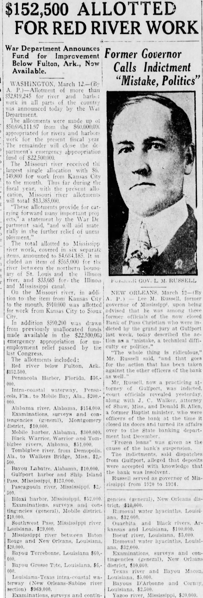$152,500 ALLOTTED FOR RED RIVER WORK War Department Announces Fund Improvement Below Fulton, Ark., Now Available. WASHINGTON March of $52,819,245 for river and harb in all parts the country today by the Was The made $50,696.11 from the $60,000,000 for and harbors for the present fiscal The will the appropriation The Missouri received largest single with $6. 149,800 for from Kansas City the Thus far during the fiscal year, with the allo allotments total $13,385,000 "These allotments provide for the De said will aid mate rially in the further relief of unem The allotted to Mississipp cluded an item $565,000 the northern bound St Louis and the illinois and $33,685 for the Illinois and the in addi tion the Kansas City the mouth. $910,000 was allotted for work from Kansas City to Sioux City In addition $590.200 was drawn previously unallocated funds available the $22,500,000 emergency for employment relief passed by the The allotments included: Red river below Fulton, Ark. Pensacola Harbor, Florida. Intra-coastal waterway. PensaFla. to Mobile Bay, Ala., $200.Examinations, surveys and contengencies Montgomery Mobile harbor Alabama, $300.000. Black Tomfrom Demopolis. to Walkers Bridge, Miss. $2,- Gulfport Ship Island (general), Mobile district. Southwest Pass. Mississippi river Mississippi between Baton Rouge and New Orleans. Louisiana, Bayou Terrebonne, Louisiana $60.Bayou Grosse Tate, Louisiana, $6,Louisiana terway (New river section) $969,000. Examinations, surveys and contin- Former Governor Calls Indictment "Mistake, Politics" NEW ORLEANS March being advised among three former officials of closed Bank dicted the grand Gulfport last today the culty whole thing is ridiculous," Mr. Russell that goes action that has taken against the other officers the Mr. Russell now practicing officials revealed yesterday along with attorney of Shaw, Miss., and Donald Allen, former Baptist minister who officers the bank at the time closed and turned affairs over the State banking department last December Frozen loans" given as the the The indictments. dispatches from Gulfport. alleged that deposits accepted that the bank Russell of Mississippi from to 1924 gencies (general), New Orleans district. $10,000. Removal water Louisi Quachita Black Arkansas Louisiana, $100,000. Examinations, surveys and contingencies (general), New Orleans Texas river and Bayou Louisiana, Bayous D'Arbonne and Yazoo river, Mississippi, $20,000.