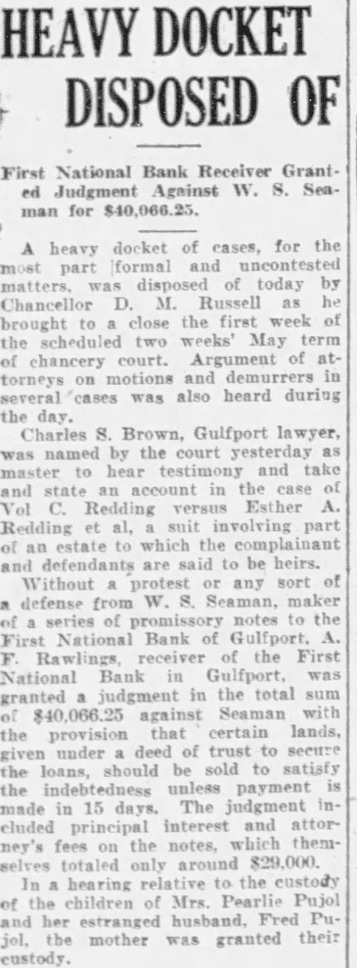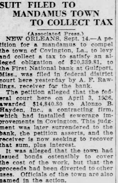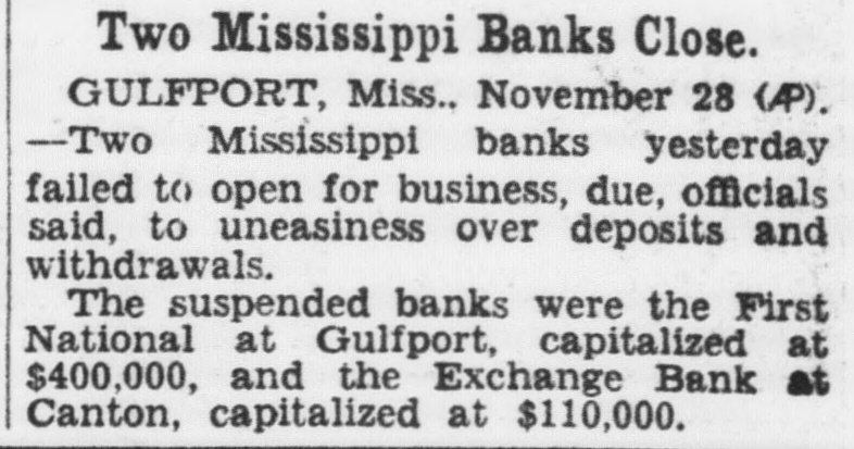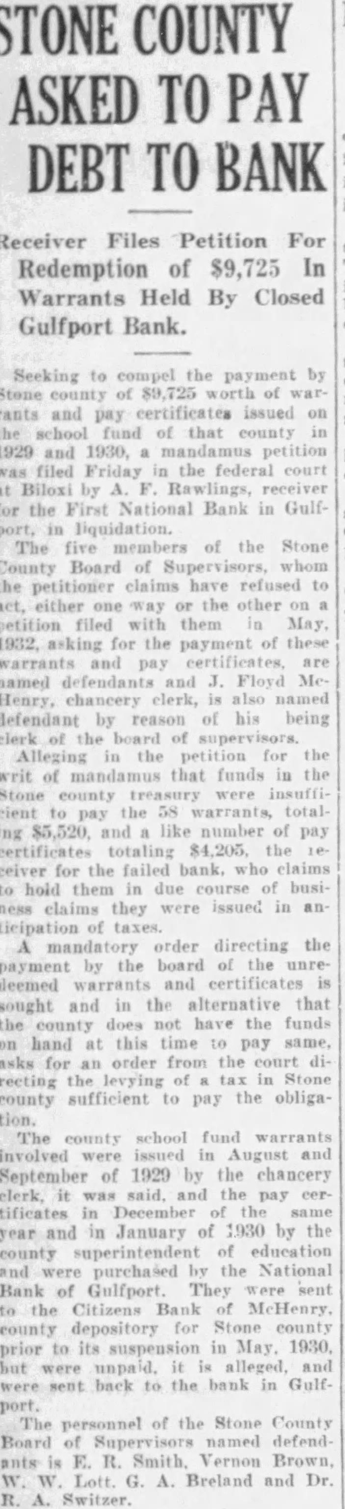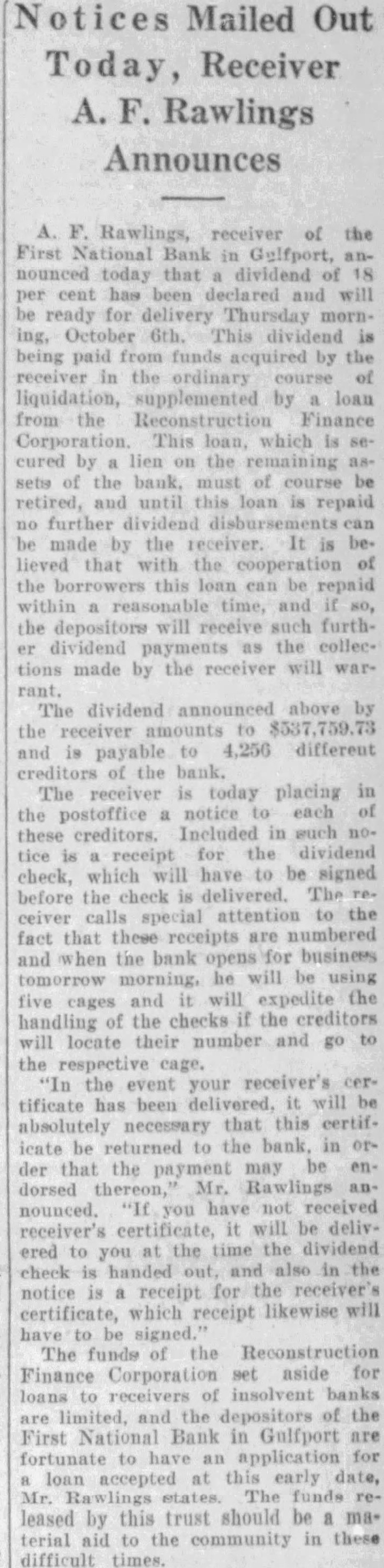 (Continued from first page) obtained a loan from the Reconstruetion Finance Corporation. "The publication of the July report of the Reconstruction Finance Corporation, during the month of August, did not have the bad effect upon the banks as predicted by the opponents of the provision. "This is shown by the greatly decreased number of bank suspensions that have occurred since the report was published. "During the month of July there were 131 suspensions. During the month of August 85 suspensions; and during the month of September 63 suspensions, XXX "All of the other objections raised in the brief as to the wisdom of policy of requiring public monthly report of the corporation's activities were presented to Congress by the corporation or other persons before the act was passed." The report itself showed that a considerable number of loans which were authorized during August were withdrawn or cancelled in full, including authorizations to 35 banks and trust companies aggregating $2,631,571. Bank and trust companies in Mississippi received loans as follows: Biloxi, Peoples Bank $20,000: Booneville, Bank of Booneville, $84,500 Clinton, Bank of Clinton $31,315.40 Greenwood, Greenwood Savings bank (receiver) $140,000. Gulfport, First Natonal Bank in Gulfport (receiver) $280,000; Kosciusko, Guaranty Bank and Trust Co. (receiver) $42,500; Kosciusko Bank $47,795.20; Lauderdale, Lauderdale State Bank $7,000: Meadville, Bank of Franklin $17,379.85 Olive Branch, Bank of Olive Branch. $30,000 Sallis, Sallis Bank (receiver) $43,500; Tunica, Planters Bank $59,965 Tupelo, Citizens State Bank $39,014.23. The Interstate Trust and Banking Co., of New Orleans received a loan of $178,275.25. INSURANCE COMPANIES Birmingham, Lincoln Reserve In surance Co., $66,200. New Orleans, Union Indemnity Co., $400,000.