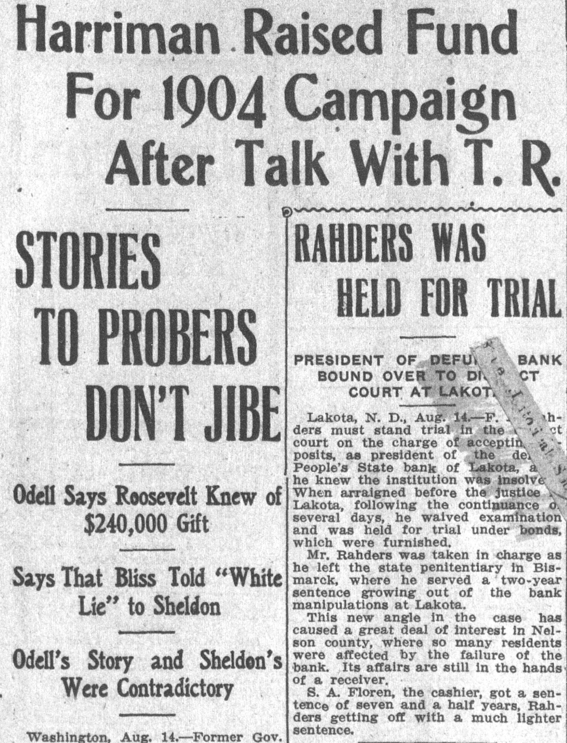 Harriman Raised Fund For 1904 Campaign After Talk With T. R. RAHDERS WAS STORIES HELD FOR TRIAL BANK PRESIDENT OF DEFU TO PROBERS CT BOUND OVER TO DI COURT AT LAKOT Lakota, N. D., Aug. 14-F. ct ders must stand trial in the DON'T JIBE court on the charge of acceptin posits, as president of the de People's State bank of Lakota, a he knew the institution was insolve When arraigned before the justice Odell Says Roosevelt Knew of Lakota, following the continuance O several days, he waived examination and was held for trial under bonds, $240,000 Gift which were furnished, Mr. Rahders was taken in charge as he left the state penitentiary in Bismarck, where he served a two-year Says That Bliss Told "White sentence growing out of the bank manipulations at Lakota. Lie" to Sheldon This new angle in the case has caused a great deal of interest in Nelson county, where so many residents were affected by the failure of the bank. Its affairs are still in the hands Odell's Story and Sheldon's of a receiver. S. A. Floren, the cashier, got a senWere Contradictory tence of seven and a half years, Rahders getting off with a much lighter sentence. Washington, Aug. 14.-Former Gov.