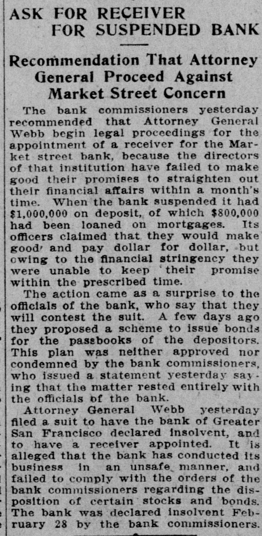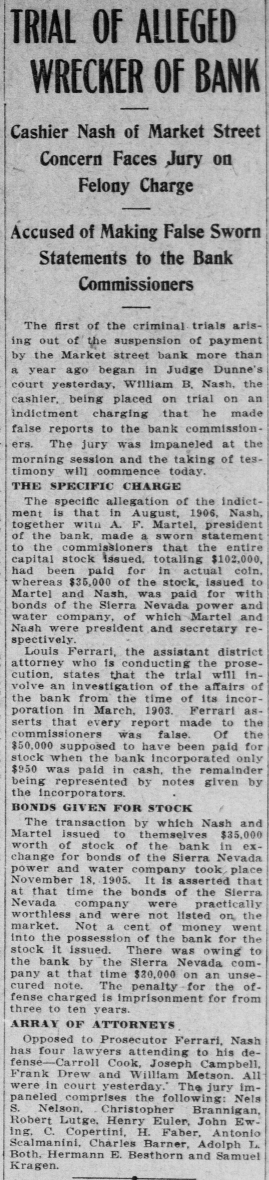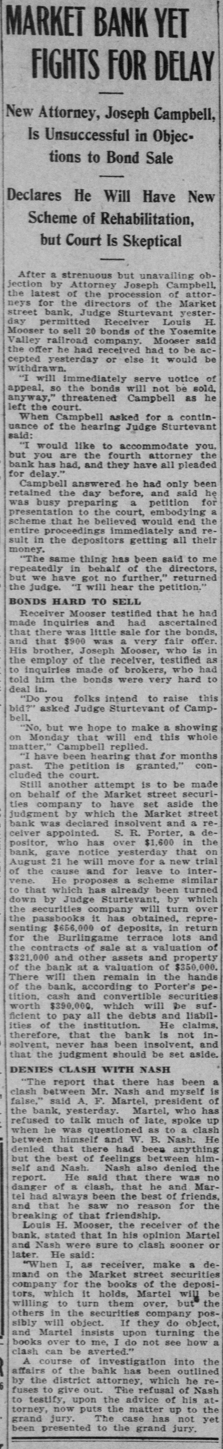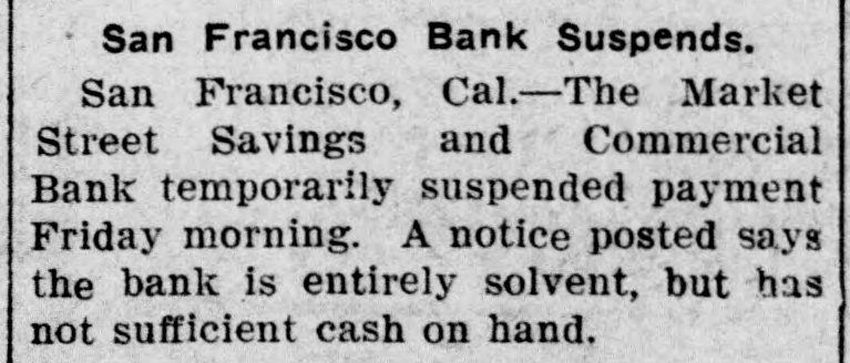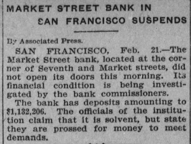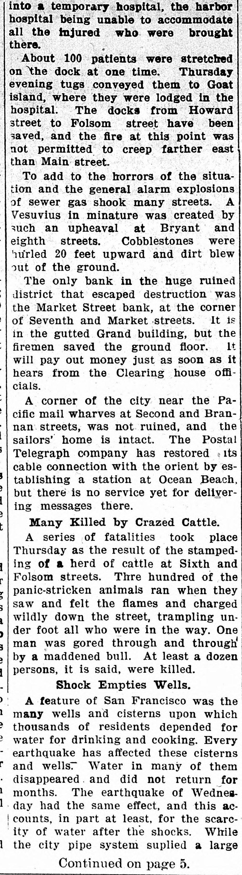 into temporary hospital, the harbor hospital being unable to accommodate all the injured who were brought there. About 100 patients were stretched on the dock at one time. Thursday evening tugs conveyed them to Goat island, where they were lodged in the hospital. The docks from Howard street to Folsom street have been saved, and the fire at this point was not permitted to creep farther east than Main street. To add to the horrors of the situation and the general alarm explosions of sewer gas shook many streets. A Vesuvius in minature was created by such an upheaval at Bryant and eighth streets. Cobblestones were burled 20 feet upward and dirt blew out of the ground. The only bank in the huge ruined district that escaped destruction was the Market Street bank, at the corner of Seventh and Market streets. It is in the gutted Grand building, but the firemen saved the ground floor. It will pay out money just as soon as it hears from the Clearing house officials. A corner of the city near the Pacific mail wharves at Second and Brannan streets, was not ruined, and the sailors' home is intact. The Postal Telegraph company has restored its cable connection with the orient by establishing a station at Ocean Beach, but there is no service yet for delivering messages there. Many Killed by Crazed Cattle. A series of fatalities took place Thursday as the result of the stampeding of a herd of cattle at Sixth and Folsom streets. Thre hundred of the panic-stricken animals ran when they saw and felt the flames and charged wildly down the street, trampling under foot all who were in the way. One man was gored through and through by a maddened bull. At least a dozen persons, it is said, were killed. Shock Empties Wells. A feature of San Francisco was the many wells and cisterns upon which thousands of residents depended for water for drinking and cooking. Every earthquake has affected these cisterns and wells. Water in many of them disappeared and did not return for months. The earthquake of Wednesday had the same effect, and this accounts, in part at least, for the scarcity of water after the shocks. While the city pipe system suplied a large Continued on page 5.