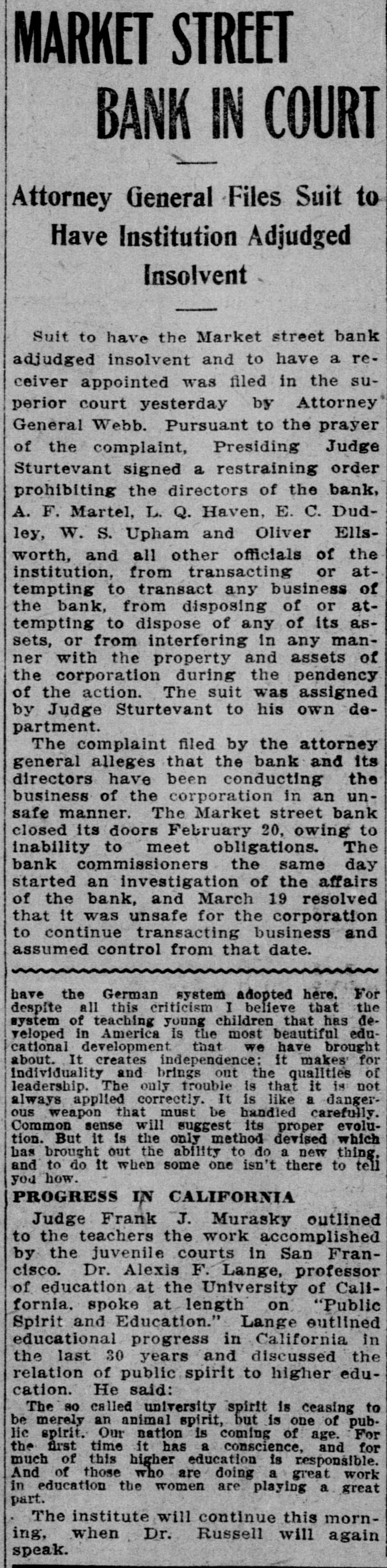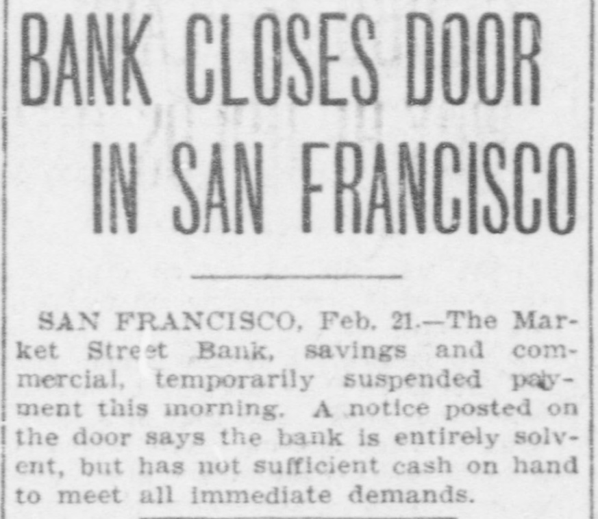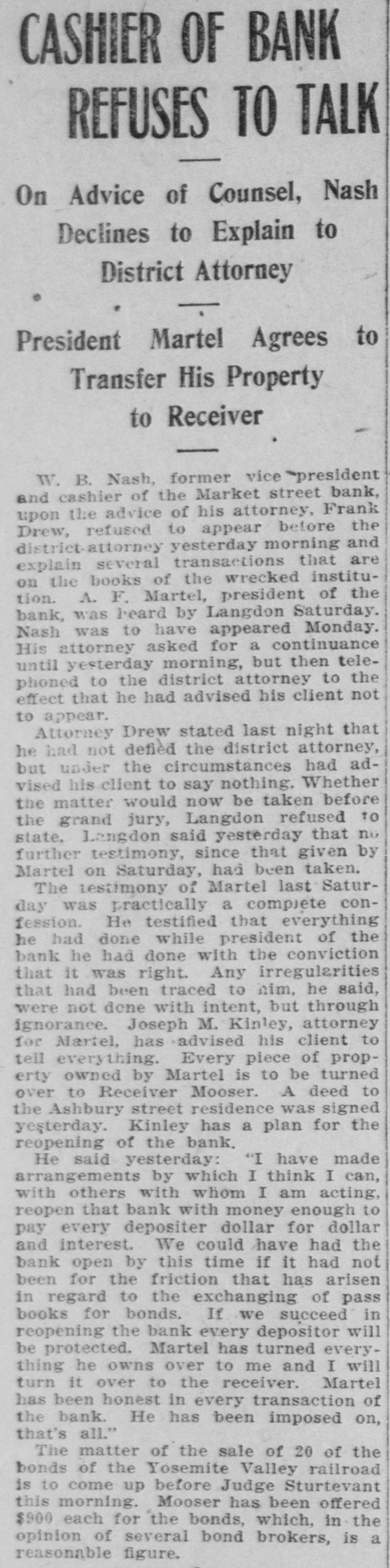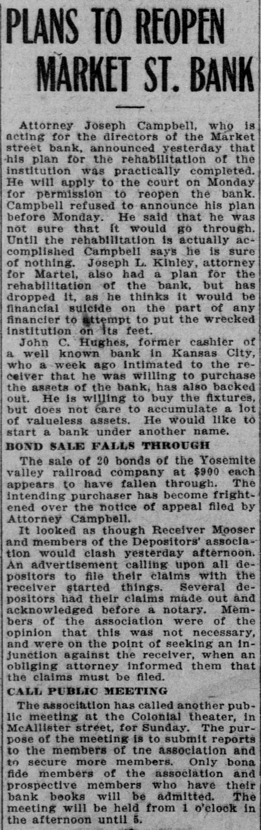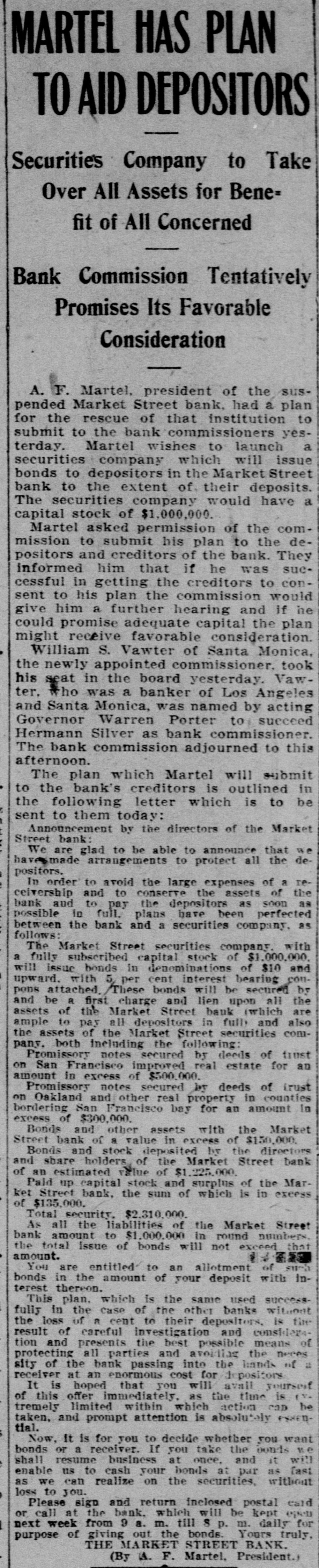 into temporary hospital, the harbor hospital being unable to accommodate all the injured who were brought there. About 100 patients were stretched on the dock at one time. Thursday evening tugs conveyed them to Goat island, where they were lodged in the hospital. The docks from Howard street to Folsom street have been saved, and the fire at this point was not permitted to creep farther east than Main street. To add to the horrors of the situation and the general alarm explosions of sewer gas shook many streets. A Vesuvius in minature was created by such an upheaval at Bryant and eighth streets. Cobblestones were burled 20 feet upward and dirt blew out of the ground. The only bank in the huge ruined district that escaped destruction was the Market Street bank, at the corner of Seventh and Market streets. It is in the gutted Grand building, but the firemen saved the ground floor. It will pay out money just as soon as it hears from the Clearing house officials. A corner of the city near the Pacific mail wharves at Second and Brannan streets, was not ruined, and the sailors' home is intact. The Postal Telegraph company has restored its cable connection with the orient by establishing a station at Ocean Beach, but there is no service yet for delivering messages there. Many Killed by Crazed Cattle. A series of fatalities took place Thursday as the result of the stampeding of a herd of cattle at Sixth and Folsom streets. Thre hundred of the panic-stricken animals ran when they saw and felt the flames and charged wildly down the street, trampling under foot all who were in the way. One man was gored through and through by a maddened bull. At least a dozen persons, it is said, were killed. Shock Empties Wells. A feature of San Francisco was the many wells and cisterns upon which thousands of residents depended for water for drinking and cooking. Every earthquake has affected these cisterns and wells. Water in many of them disappeared and did not return for months. The earthquake of Wednesday had the same effect, and this accounts, in part at least, for the scarcity of water after the shocks. While the city pipe system suplied a large Continued on page 5.