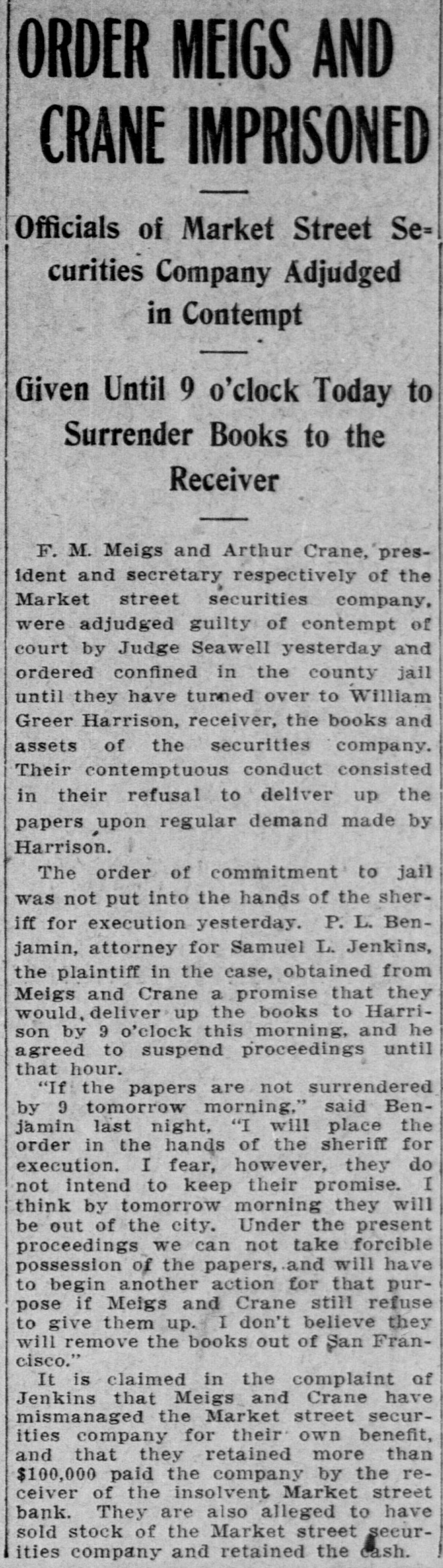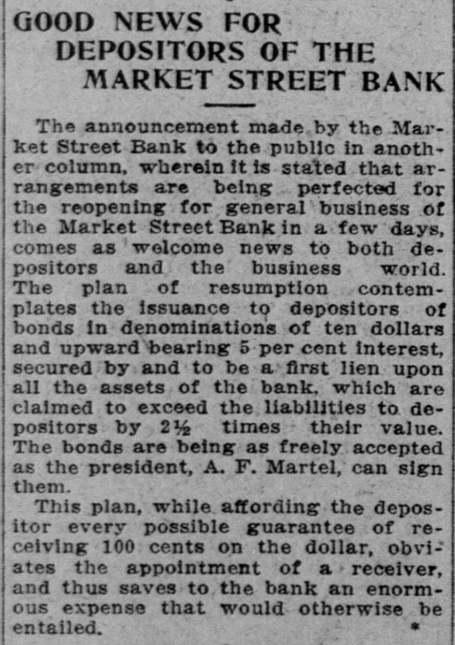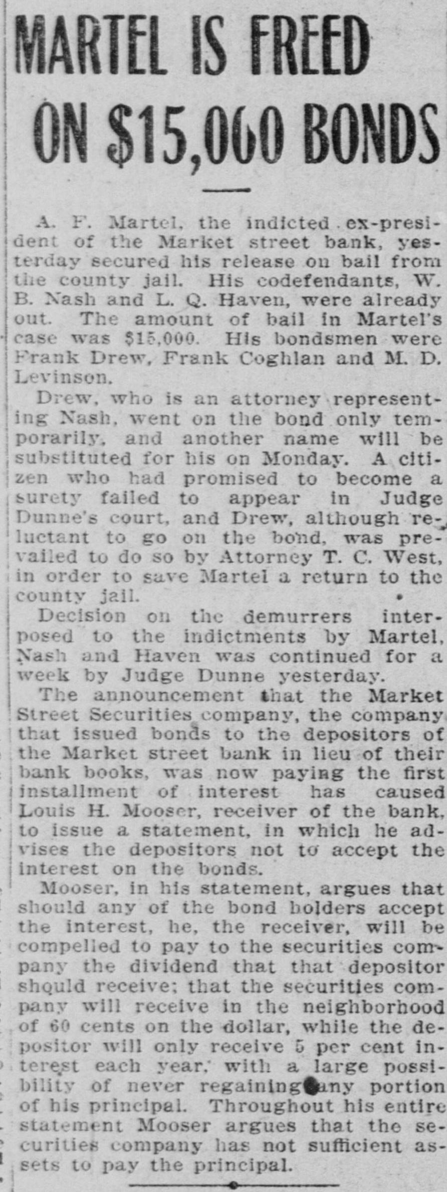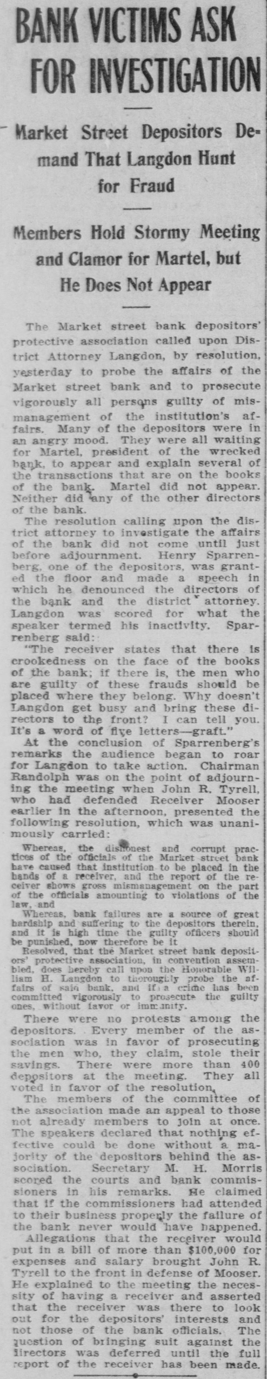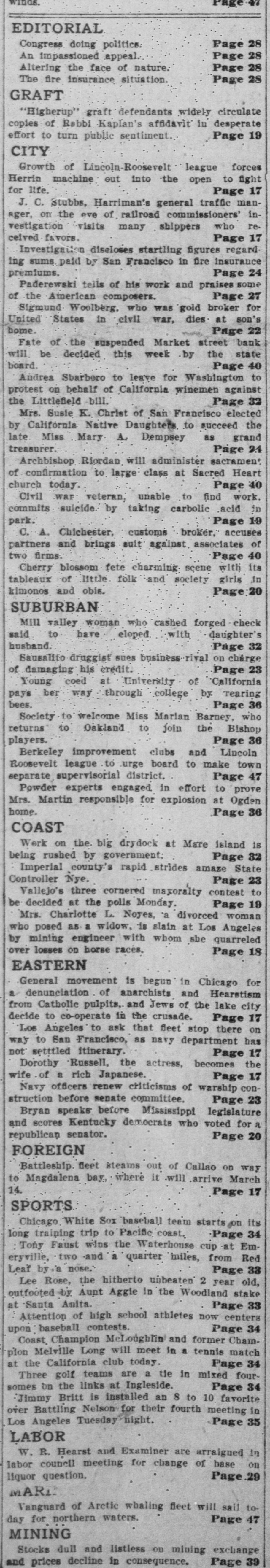 into temporary hospital, the harbor hospital being unable to accommodate all the injured who were brought there. About 100 patients were stretched on the dock at one time. Thursday evening tugs conveyed them to Goat island, where they were lodged in the hospital. The docks from Howard street to Folsom street have been saved, and the fire at this point was not permitted to creep farther east than Main street. To add to the horrors of the situation and the general alarm explosions of sewer gas shook many streets. A Vesuvius in minature was created by such an upheaval at Bryant and eighth streets. Cobblestones were burled 20 feet upward and dirt blew out of the ground. The only bank in the huge ruined district that escaped destruction was the Market Street bank, at the corner of Seventh and Market streets. It is in the gutted Grand building, but the firemen saved the ground floor. It will pay out money just as soon as it hears from the Clearing house officials. A corner of the city near the Pacific mail wharves at Second and Brannan streets, was not ruined, and the sailors' home is intact. The Postal Telegraph company has restored its cable connection with the orient by establishing a station at Ocean Beach, but there is no service yet for delivering messages there. Many Killed by Crazed Cattle. A series of fatalities took place Thursday as the result of the stampeding of a herd of cattle at Sixth and Folsom streets. Thre hundred of the panic-stricken animals ran when they saw and felt the flames and charged wildly down the street, trampling under foot all who were in the way. One man was gored through and through by a maddened bull. At least a dozen persons, it is said, were killed. Shock Empties Wells. A feature of San Francisco was the many wells and cisterns upon which thousands of residents depended for water for drinking and cooking. Every earthquake has affected these cisterns and wells. Water in many of them disappeared and did not return for months. The earthquake of Wednesday had the same effect, and this accounts, in part at least, for the scarcity of water after the shocks. While the city pipe system suplied a large Continued on page 5.