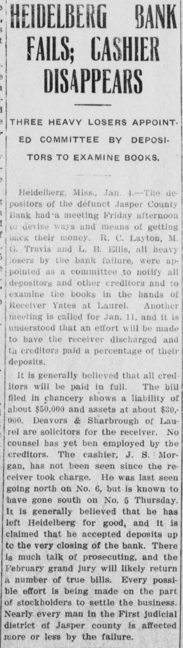 HEIDELBERG BANK FAILS; CASHIER DISAPPEARS THREE HEAVY LOSERS APPOINTED COMMITTEE BY DEPOSITORS TO EXAMINE BOOKS. Heidelberg, Miss., Jan. 4.-The depositors of the défunct Jasper County Bank had'a meeting Friday afternoon to devise ways and means of getting back their money. R. C. Layton, M. G. Travis and L. B. Ellis, all heavy losers by the bank failure, were appointed as a committee to notify all depositors and other creditors and to examine the books in the hands of Receiver Yates at Laurel. Another meeting is called for Jan. 11, and it is understood that an effort will be made to have the receiver discharged and th creditors paid a percentage of their deposits. It is generally believed that all creditors will be paid in full. The bill filed in chancery shows a liability of about $50,000 and assets at about $30,000. Deavors & Sharbrough of Laurel are solicitors for the receiver. No counsel has yet ben employed by the creditors. The cashier, J. S. Morgan, has not been seen since the receiver took charge. He was last seen going north on No. 6, but is known to have gone south on No. 5 Thursday. It is generally believed that he has left Heidelberg for good, and it is claimed that he accepted deposits up to the very closing of the bank. There is much talk of prosecuting, and the February grand jury will likely return a number of true bills. Every possible effort is being made on the part of stockholders to settle the business. Nearly every man in the First judicial district of Jasper county is affected more or less by the failure.