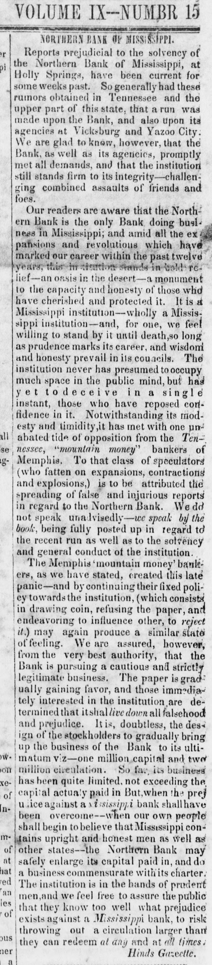 VOLUME IX--NUMBR 15 NORTHERN BANK OF MISSISSIPPI. r Reports prejudicial to the solvency of the Northern Bank of Mississippi, at pi Holly Springs, have been current for some weeks past. So generally had these rumors obtained in Tennessee and the upper part of this state, that a run was made upon the Bank, and also upon its agencies at Vicksburg and Yazoo City. We are glad to know, however, that the Bank, as well as its agencies, promptly met all demands, and that the institution still stands firm to its integrity-challenging combined assaults of friends and foes. Our readers are aware that the North ern Bank is the only Bank doing busi. ness in Mississippi; and amid all the ex pansions and revolutions which have marked our career within the past twelve years, this in visution lief-an oasis in the desert-amonument to the capacity and honesty of those who have cherished and protected it. It is a Mississippi institution-wholly a Mississippi institution-and, for one, we feel willing to stand by it until death,so long as prudence marks its career, and wisdom and honesty prevail in its couacils. The institution never has presumed to occupy much space in the public mind, but has vettodeceive in a single instant, those who have reposed confidence in it. Notwithstanding its modesty and timidity, it has met with one unall abated tide of opposition from the Tense nessee, "mountain money" bankers of gMemphis, To that class of speculators (who fatten on expansions, contractions and explosions,) is to be attributed the spreading of false and injurious reports in regard to the Northern Bank. Wedd not speak unadvisedly-uc speak by the book, being fully posted up in regard td the recent run as well as to the solvency and general conduct of the institution. The Memphis mountain money' bankers, as we have stated, created this late panic-and by continuing their fixed policy towards the institution, (which consists in drawing coin, refusing the paper, and endeavoring to influence other, to reject it.) may again produce a similar state of feeling. We are assured, however, from the very best authority, that the Bank is pursuing a cautious and strictly legitimate business. The paper is grad ually gaining favor, and those immediately interested in the institution are determined that itshal down all falsehood and prejudice. It is, doubtless, the des ign of the stockholders to gradually bring up the business of the Bank to its ultimatum viz-one million capital and two on million circulation. So far its business xehas been quite limited. not exceeding the of capital actualy paid in But, when the prej nNiceagainst a ississippi bank shallhave been overcome-when our own people shall begin to believe that Mississippi con mtains upright and honest men as well as of other states--the Northern Bank may at safely enlarge its capital paid in, and do hat a business commensurate with its charter. ved The institution is in the hands of prudent an and we feel free to assure the public les that they know too well what prejudice of exists against a Mississippi bank, to risk throwing out a circulation larger than ous they can redeem at any and at all times her Hinds Gazectte. a