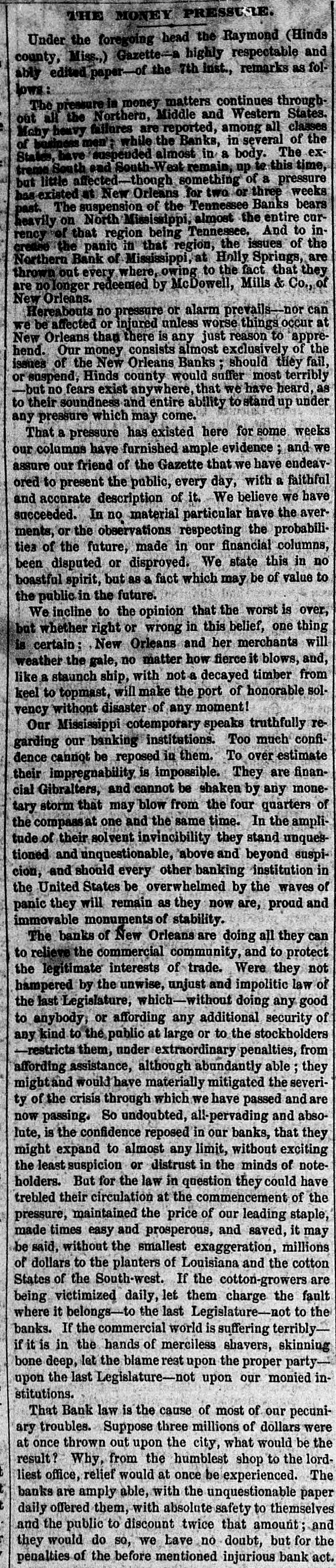 # THE MONEY PRESSURE. Under the foregoing head the Raymond (Hinds county, Miss.,) Gazette a highly respectable and ably edited paper-of the 7th inst., remarks as follows: The pressure in money matters continues throughout all the Northern, Middle and Western States. Mahy heavy failures are reported, among all classes of business men; while the Banks, in several of the States, have suspended almost in a body. The extreme South sad South-West remain, up to this time, but little affected-though something of a pressure has existed at New Orleans for two or three weeks past. The suspension of the Tennessee Banks bears heavily on North Mississippi, almost the entire currency of that region being Tennessee, And to increase the panic in that region, the issues of the Northern Bank of Mississippi, at Holly Springs, are thrown out every where, owing to the fact that they are no longer redeemed by McDowell, Mills & Co., of New Orleans. Hereabouts no pressure or alarm prevails-nor can we be affected or injured unless worse things occur at New Orleans than there is any just reason to apprehend. Our money consists almost exclusively of the issues of the New Orleans Banks; should thiey fail, or suspend, Hinds county would suffer most terribly -but no fears exist anywhere, that we have heard, as to their soundness and entire ability to stand up under any pressure which may come. That a pressure has existed here for some weeks our columus have furnished ample evidence; and we assure our friend of the Gazette that we have endeavored to present the public, every day, with a faithful and accurate description of it. We believe we have succeeded. In no material particular have the averments, or the observations respecting the probabilities of the future, made in our financial columns, been disputed or disproved. We state this in no boastful spirit, but as a fact which may be of value to the public in the future. We incline to the opinion that the worst is over, but whether right or wrong in this belief, one thing is certain: New Orleans and her merchants will weather the gale, no matter how fierce it blows, and, like a staunch ship, with not a decayed timber from keel to topmast, will make the port of honorable solvency without disaster of any moment! Our Mississippi cotemporary speaks truthfully regarding our banking institutions. Too much confidence cannot be reposed in them. To over estimate their impregnability is impossible. They are financial Gibralters, and cannot be shaken by any monetary storm that may blow from the four quarters of the compass at one and the same time. In the amplitude of their solvent invincibility they stand unquestioned and unquestionable, above and beyond suspicion, and should every other banking institution in the United States be overwhelmed by the waves of panic they will remain as they now are, proud and immovable monuments of stability. The banks of New Orleans are doing all they can to relieve the commercial community, and to protect the legitimate interests of trade. Were they not hampered by the unwise, unjust and impolitic law of the last Legislature, which-without doing any good to anybody, or affording any additional security of any kind to the public at large or to the stockholders -restricts them, under extraordinary penalties, from affording assistance, although abundantly able; they might and would have materially mitigated the severity of the crisis through which we have passed and are now passing. So undoubted, all-pervading and absolute, is the confidence reposed in our banks, that they might expand to almost any limit, without exciting the least suspicion or distrust in the minds of noteholders. But for the law in question they could have trebled their circulation at the commencement of the pressure, maintained the price of our leading staple, made times easy and prosperous, and saved, it may be said, without the smallest exaggeration, millions of dollars to the planters of Louisiana and the cotton States of the South-west. If the cotton-growers are being victimized daily, let them charge the fault where it belongs-to the last Legislature-not to the banks. If the commercial world is suffering terribly-if it is in the hands of merciless shavers, skinning bone deep, let the blame rest upon the proper party-upon the last Legislature-not upon our monied institutions. That Bank law is the cause of most of our pecuniary troubles. Suppose three millions of dollars were at once thrown out upon the city, what would be the result? Why, from the humblest shop to the lordliest office, relief would at once be experienced. The banks are amply able, with the unquestionable paper daily offered them, with absolute safety to themselves and the public to discount twice that amount; and they would do so, we have no doubt, but for the penalties of the before mentioned injurious bank act.