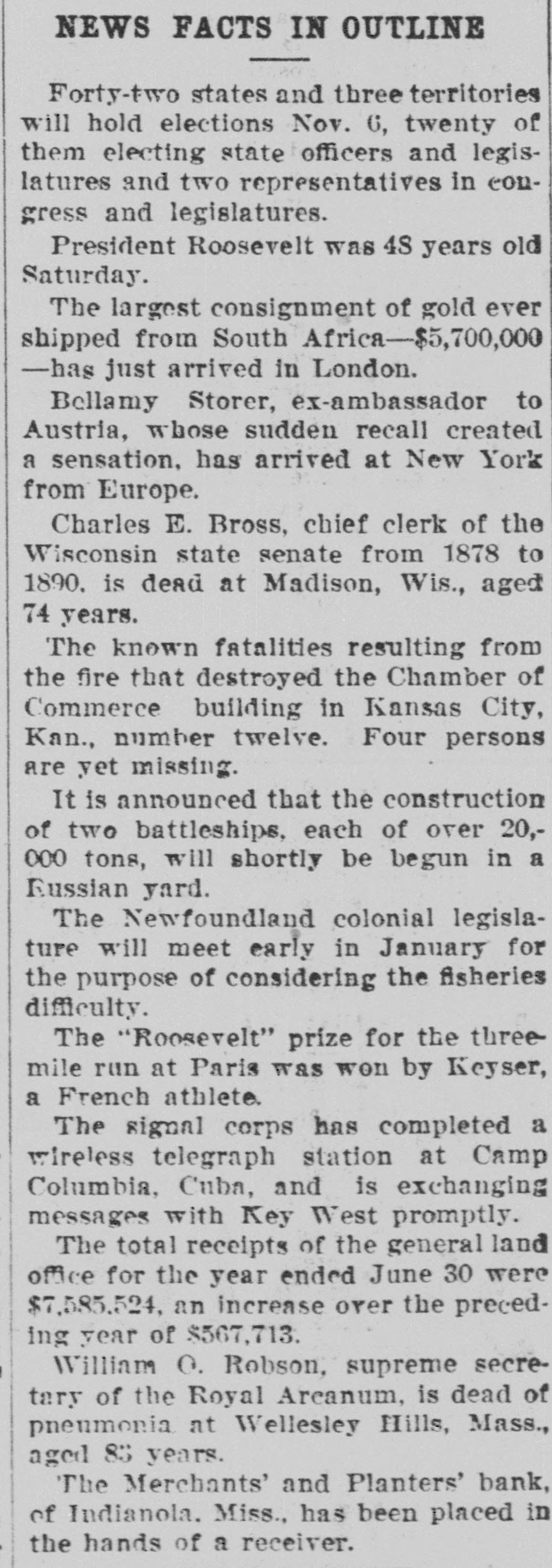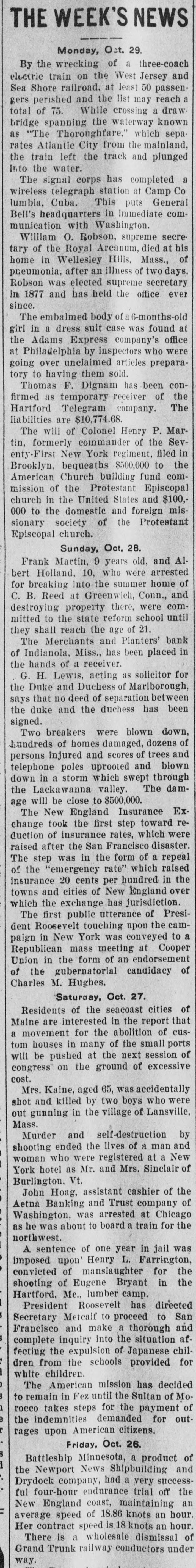 THE WEEK'S NEWS Monday, Oct. 29. By the wrecking of a three-coach electric train on the West Jersey and Sea Shore railroad, at least 50 passengers perished and the list may reach a total of 75. While crossing a draw bridge spanning the waterway known as "The Thoroughfare," which sepaCity from the left the track and rates the train Atlantic mainland, plunged Into the water. corps has wireless telegraph station at Co The signal completed Camp a lumbia, Cuba. This puts General Bell's beadquarters in immediate com munication with Washington. William O. Robson, supreme secretary of the Royal Arcanum, died at his home in Wellesley Hills, Mass., of pneumonia. after an illness of 0 days. Robson was elected supreme secretary in 1877 and has held the office ever since. The embalmed body of 6-months-old girl in a dress suit case was found at Express the Adams company's office at Philadelphia by inspectors who were going over unclaimed articles preparatory to having them sold. Thomas F. Dignam has been confirmed as temporary receiver of the Hartford Telegram company. The liabilities are $10,774.68 The will of Colonel Henry P. Martin, formerly commander of the Seventy-First New York in bequeaths $500,000 Church Brooklyn, American building regiment, fund to filed com- the mission of the Protestant Episcopal church in the United States and $100,000 to the domestic and foreign missionary society of the Protestant Episcopal church. Sunday, Oct. 28. Frank Martin, 9 years old, and Albert Holland, 10, who were arrested for breaking into the summer home of C. B. Reed at Greenwich, Conn., and destroying property there, were committed to the state reform school until they shall reach the age of 21. The Merchants and Planters' bank of Indianola, Miss., has been placed in the hands of a receiver. G. H. Lewis, acting as solicitor for the Duke and Duchess of Marlborough, says that no deed of separation between the duke and the duchess has been signed. Two breakers were blown down, hundreds of homes damaged, dozens of persons injured and scores of trees and telephone poles uprooted and blown a storm which down in swept through damThe the Lackawanna valley. age will be close to $500,000. The New England Insurance Exchange took the first step toward reduction of insurance rates, which were raised after the San Francisco disaster. The step was in the form of a repeal of the "emergency rate" which raised insurance 20 cents per hundred in the towns and cities of New England over which the exchange has jurisdiction. The first public utterance of President Roosevelt touching upon the camYork was to paign in New conveyed Republican mass meeting at Cooper Union in the form of an endorsement of the gubernatorial candidacy of Charles M. Hughes. Saturday, Oct. 27. Residents of the seacoast cities of Maine are interested in the report that a movement for the abolition of custom houses in many of the small ports will be pushed at the next session of congress on the ground of excessive cost. Mrs. Kaine, aged 65, was accidentally shot and killed by two boys who were out gunning in the village of Lansville, Mass. Murder and self-destruction by shooting ended the lives of a man and woman who were registered at a New York hotel as Mr. and Mrs. Sinclair Burlington, Vt. John Hoag, assistant cashier of the Aetna Banking and Trust company of Washington, was arrested at Chicago as he was about to board a train for the northwest. A sentence of one year in jail was imposed upon' Henry L. Farrington, convicted of manslaughter for the shooting of Eugene Bryant in the Hartford, Me., lumber camp. President Roosevelt has directed Secretary Metcalf to proceed to San Francisco and make a thorough and complete inquiry into the situation af fecting the expulsion of Japanese children from the schools provided for white children. The American mission has decided 3 to remain in Fez until the Sultan of Morocco takes steps for the payment of e the indemnities demanded for outrages upon American citizens. Friday, Oct. 26. 3 Battleship Minnesota, a product of I the Newport News Shipbuilding and Drydock company, had a very successful four-hour endurance trial off coast, knots New Her average England speed of 18.86 maintaining an hour the an contract speed is,18 knots an hour of There is a wholesale dismissal Grand Trunk railway conductors under way.