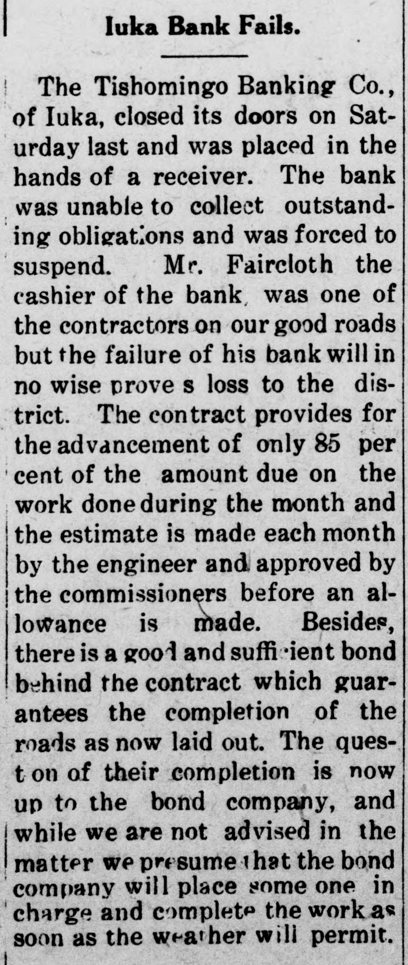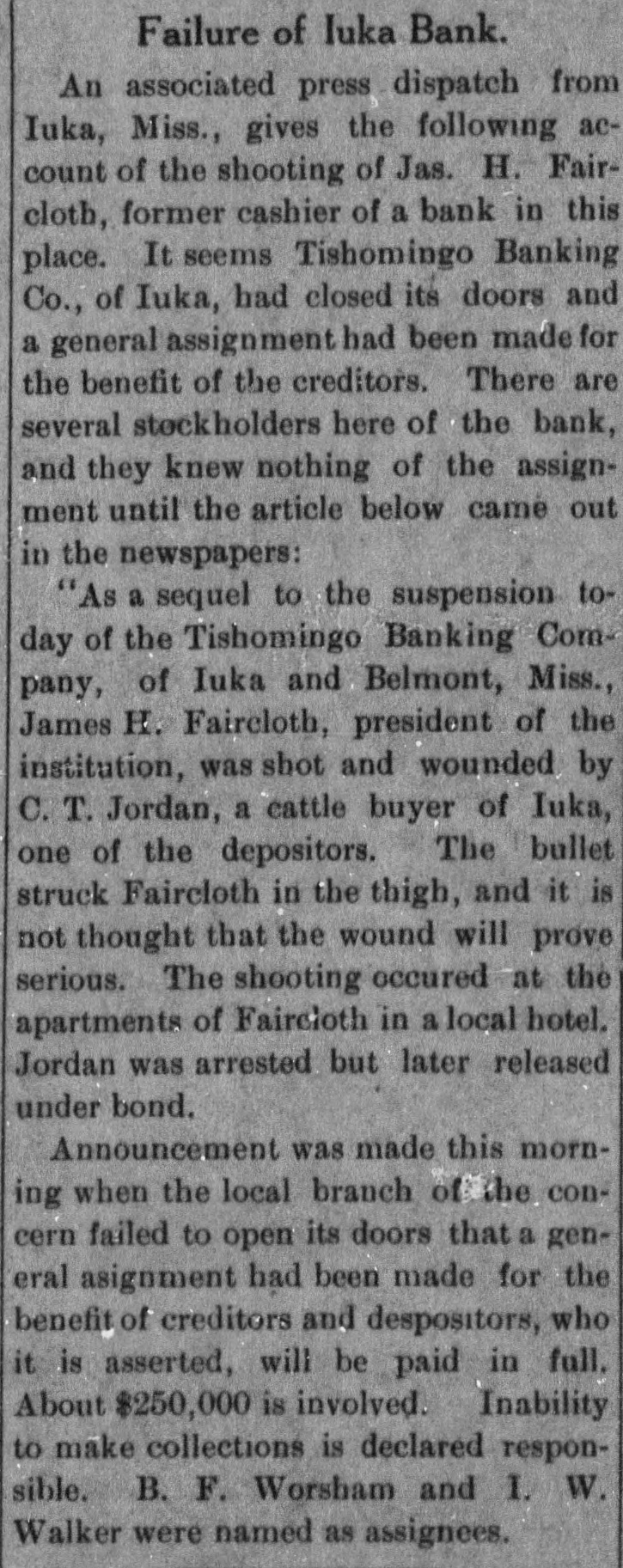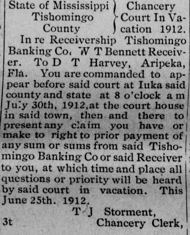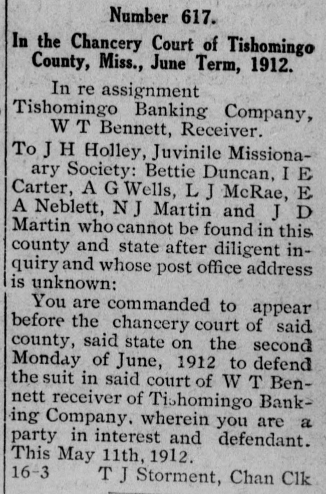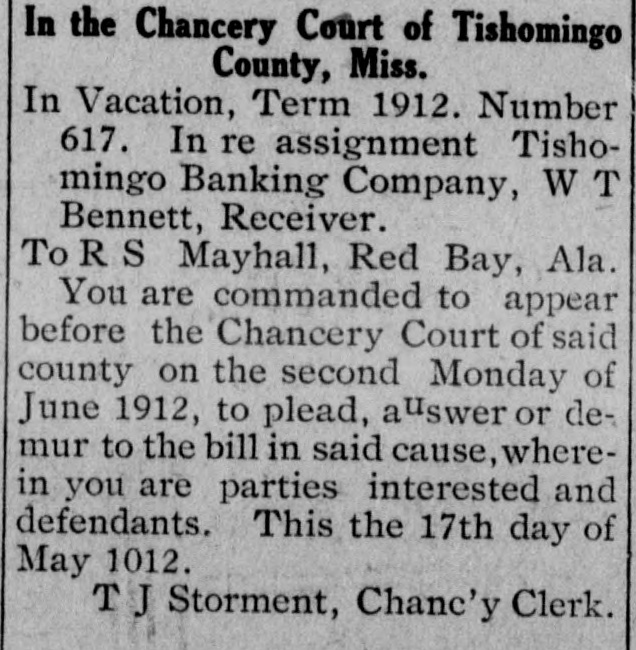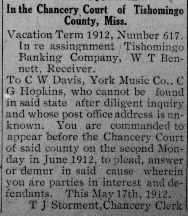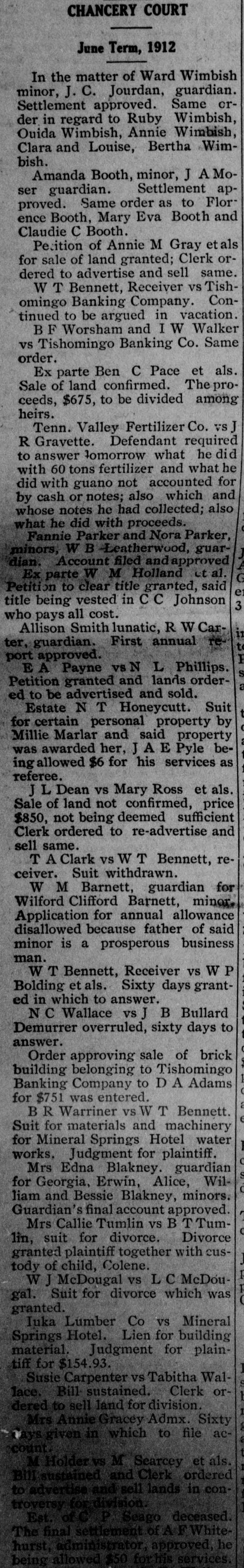CHANCERY COURT June Term, 1912 In the matter of Ward Wimbish minor, J. C. Jourdan, guardian. Settlement approved. Same order in regard to Ruby Wimbish, Ouida Wimbish, Annie Wimbish, Clara and Louise, Bertha Wimbish. Amanda Booth, minor, J A Moser guardian. Settlement approved. Same order as to Florence Booth, Mary Eva Booth and Claudie C Booth. Petition of Annie M Gray et als for sale of land granted; Clerk ordered to advertise and sell same. W T Bennett, Receiver vs Tishomingo Banking Company. Continued to be argued in vacation. B F Worsham and I W Walker vs Tishomingo Banking Co. Same order. Ex parte Ben C Pace et als. Sale of land confirmed. The proceeds, $675, to be divided among heirs. Tenn. Valley Fertilizer Co. vs J R Gravette. Defendant required to answer 4omorrow what he did with 60 tons fertilizer and what he did with guano not accounted for by cash or notes; also which and whose notes he had collected; also what he did with proceeds. Fannie Parker and Nora Parker, minors, W B Leatherwood, guardian. Account filed andapproved Ex parte W M Holland ct al. Petition to clear title granted, said title being vested in CC Johnson 3 who pays all cost. Allison Smith lunatic, R W Carter, guardian. First annual re port approved. E A Payne vs N L Phillips. Petition granted and lands ordered to be advertised and sold. Estate N T Honeycutt. Suit for certain personal property by Millie Marlar and said property was awarded her, J A E Pyle being allowed $6 for his services as referee. J L Dean vs Mary Ross et als. Sale of land not confirmed, price $850, not being deemed sufficient Clerk ordered to re-advertise and sell same. T A Clark vs W T Bennett, receiver. Suit withdrawn. W M Barnett, guardian for Wilford Clifford Barnett, minor. Application for annual allowance disallowed because father of said minor is a prosperous business man. W T Bennett, Receiver vs W P Bolding et als. Sixty days granted in which to answer. N C Wallace vs J B Bullard Demurrer overruled, sixty days to answer. Order approving sale of brick building belonging to Tishomingo Banking Company to D A Adams for $751 was entered. B R Warriner vs W T Bennett. Suit for materials and machinery for Mineral Springs Hotel water works. Judgment for plaintiff. Mrs Edna Blakney. guardian for Georgia, Erwin, Alice, William and Bessie Blakney, minors. Guardian's final account approved. Mrs Callie Tumlin vs B T Tumlin, suit for divorce. Divorce granted plaintiff together with custody of child, Colene. W J McDougal vs L C McDougal. Suit for divorce which was granted. Iuka Lumber Co vs Mineral Springs Hotel. Lien for building material. Judgment for plaintiff for $154.93. Susie Carpenter vs Tabitha Wallace. Bill sustained. Clerk ordered to sell land for division. Mrs Annie Gracey Admx. Sixty . ys given in which to file account. M Holder vs M Searcey et als. Bill sustained and Clerk ordered to advertise and sell lands in controversy for division. Est. of C P Seago deceased. The final settlement of AF White-