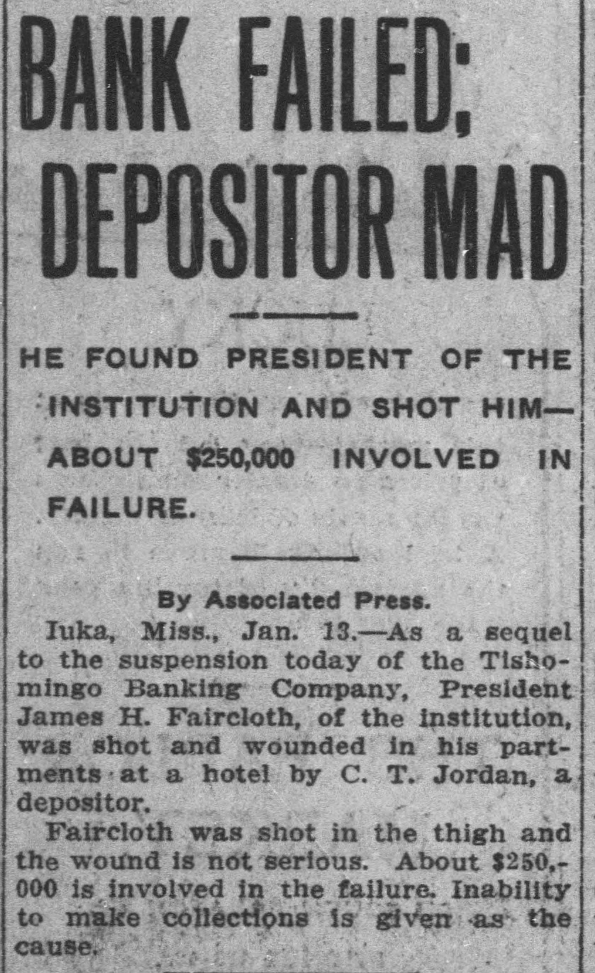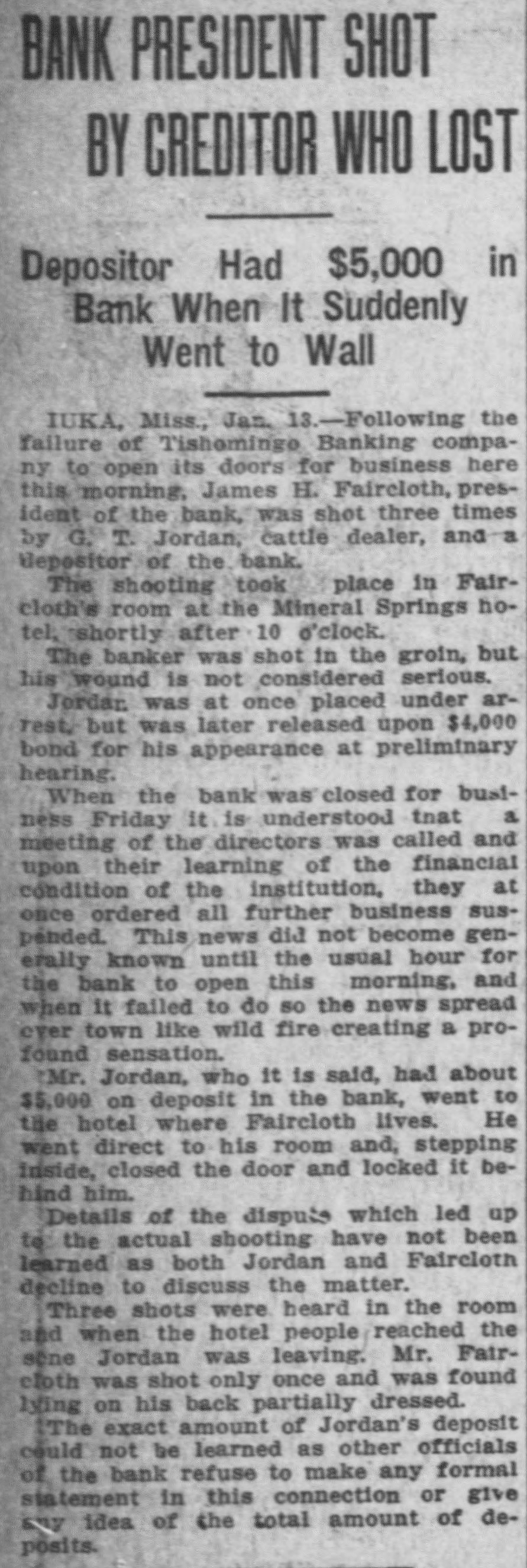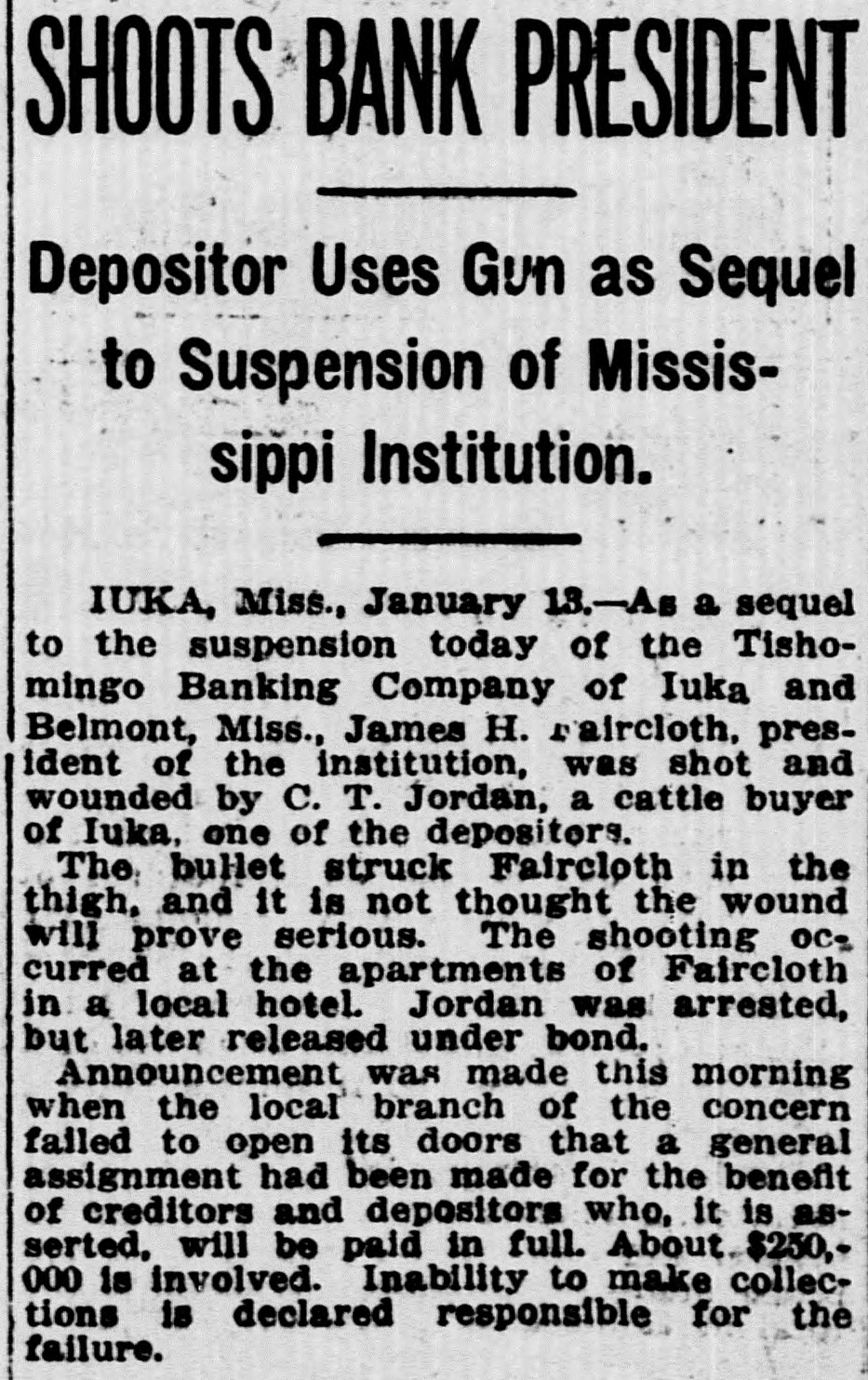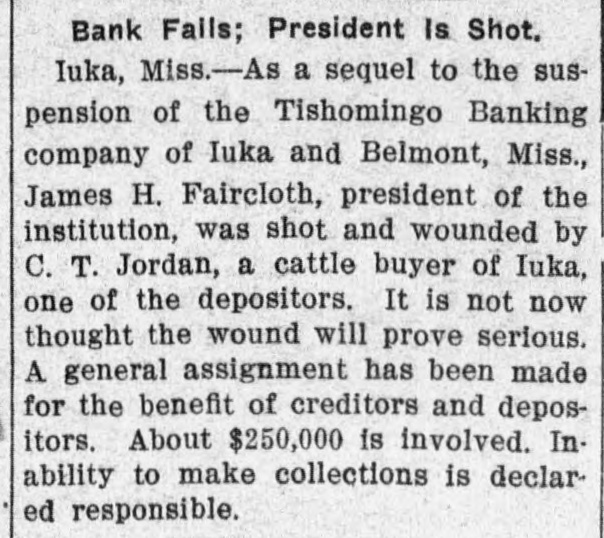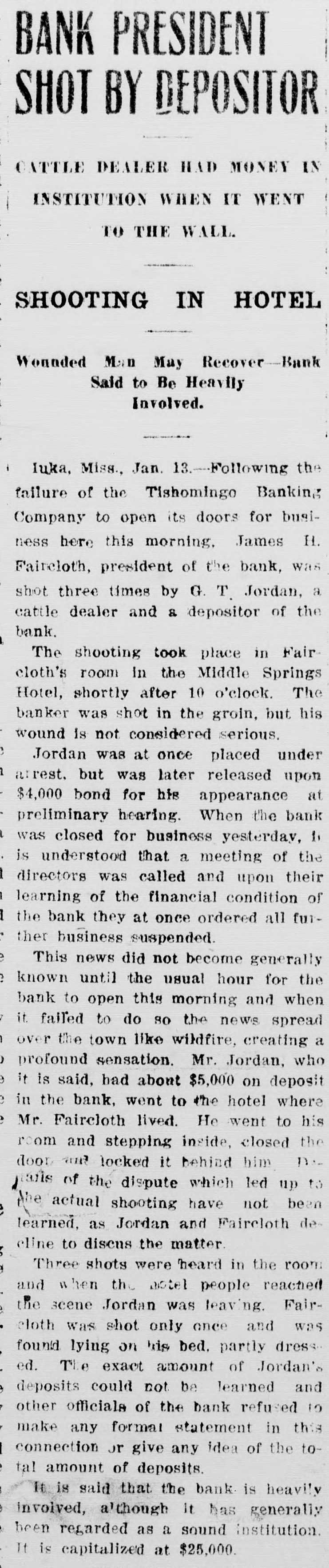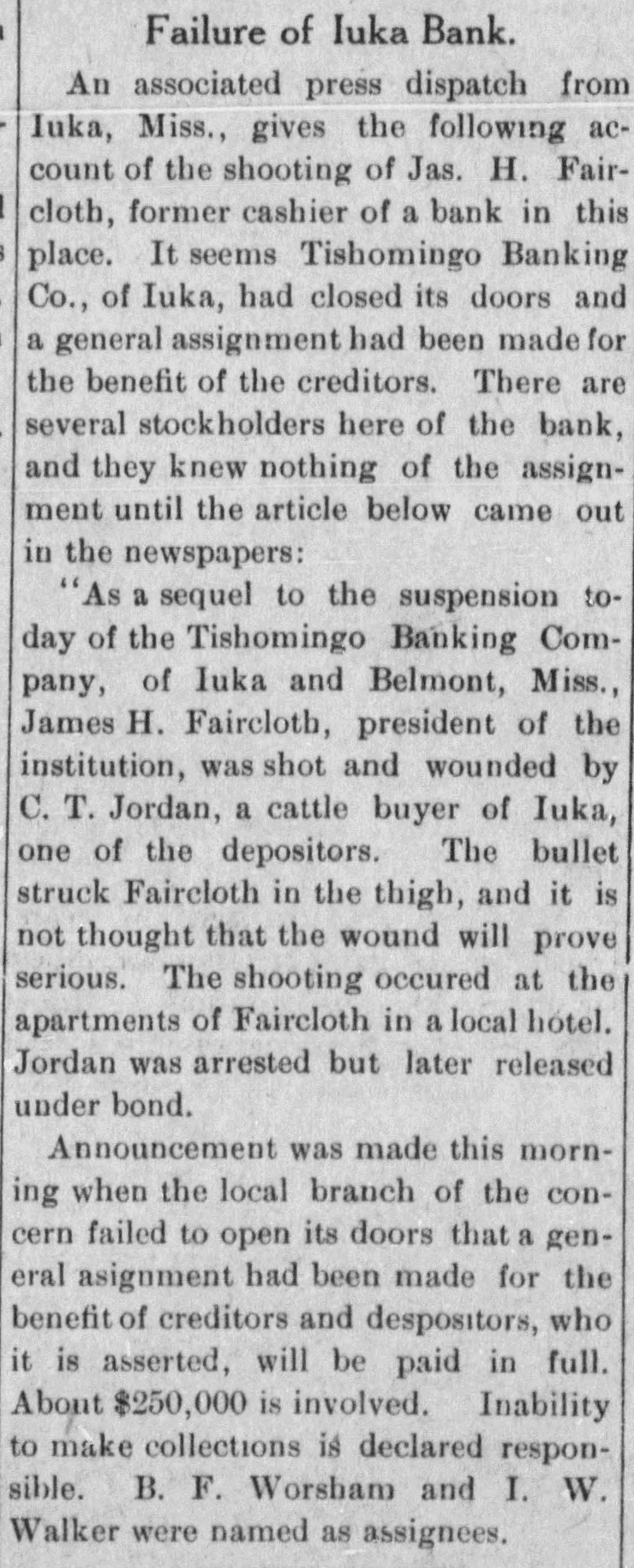 CHANCERY COURT June Term, 1912 In the matter of Ward Wimbish minor, J. C. Jourdan, guardian. Settlement approved. Same order in regard to Ruby Wimbish, Ouida Wimbish, Annie Wimbish, Clara and Louise, Bertha Wimbish. Amanda Booth, minor, J A Moser guardian. Settlement approved. Same order as to Florence Booth, Mary Eva Booth and Claudie C Booth. Petition of Annie M Gray et als for sale of land granted; Clerk ordered to advertise and sell same. W T Bennett, Receiver vs Tishomingo Banking Company. Continued to be argued in vacation. B F Worsham and I W Walker vs Tishomingo Banking Co. Same order. Ex parte Ben C Pace et als. Sale of land confirmed. The proceeds, $675, to be divided among heirs. Tenn. Valley Fertilizer Co. vs J R Gravette. Defendant required to answer 4omorrow what he did with 60 tons fertilizer and what he did with guano not accounted for by cash or notes; also which and whose notes he had collected; also what he did with proceeds. Fannie Parker and Nora Parker, minors, W B Leatherwood, guardian. Account filed andapproved Ex parte W M Holland ct al. Petition to clear title granted, said title being vested in CC Johnson 3 who pays all cost. Allison Smith lunatic, R W Carter, guardian. First annual re port approved. E A Payne vs N L Phillips. Petition granted and lands ordered to be advertised and sold. Estate N T Honeycutt. Suit for certain personal property by Millie Marlar and said property was awarded her, J A E Pyle being allowed $6 for his services as referee. J L Dean vs Mary Ross et als. Sale of land not confirmed, price $850, not being deemed sufficient Clerk ordered to re-advertise and sell same. T A Clark vs W T Bennett, receiver. Suit withdrawn. W M Barnett, guardian for Wilford Clifford Barnett, minor. Application for annual allowance disallowed because father of said minor is a prosperous business man. W T Bennett, Receiver vs W P Bolding et als. Sixty days granted in which to answer. N C Wallace vs J B Bullard Demurrer overruled, sixty days to answer. Order approving sale of brick building belonging to Tishomingo Banking Company to D A Adams for $751 was entered. B R Warriner vs W T Bennett. Suit for materials and machinery for Mineral Springs Hotel water works. Judgment for plaintiff. Mrs Edna Blakney. guardian for Georgia, Erwin, Alice, William and Bessie Blakney, minors. Guardian's final account approved. Mrs Callie Tumlin vs B T Tumlin, suit for divorce. Divorce granted plaintiff together with custody of child, Colene. W J McDougal vs L C McDougal. Suit for divorce which was granted. Iuka Lumber Co vs Mineral Springs Hotel. Lien for building material. Judgment for plaintiff for $154.93. Susie Carpenter vs Tabitha Wallace. Bill sustained. Clerk ordered to sell land for division. Mrs Annie Gracey Admx. Sixty . ys given in which to file account. M Holder vs M Searcey et als. Bill sustained and Clerk ordered to advertise and sell lands in controversy for division. Est. of C P Seago deceased. The final settlement of AF White-