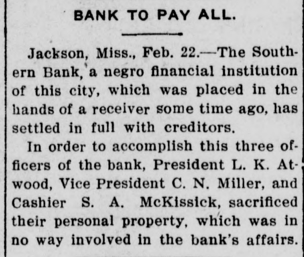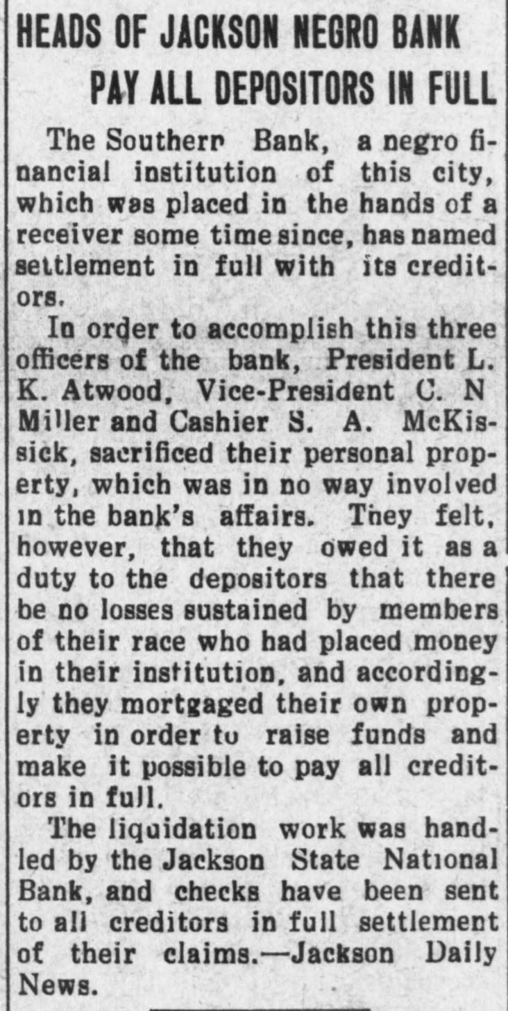 HEADS OF JACKSON NEGRO BANK PAY ALL DEPOSITORS IN FULL The Southern Bank, a negro financial institution of this city, which was placed in the hands of a receiver some time since, has named settlement in full with its creditors. In order to accomplish this three officers of the bank, President L. K. Atwood, Vice-President C. N Miller and Cashier S. A. McKissick, sacrificed their personal property, which was in no way involved in the bank's affairs. They felt, however, that they owed it as a duty to the depositors that there be no losses sustained by members of their race who had placed money in their institution, and accordingly they mortgaged their own property in order to raise funds and make it possible to pay all creditors in full. The liquidation work was handled by the Jackson State National Bank, and checks have been sent to all creditors in full settlement of their claims.-Jackson Daily News.