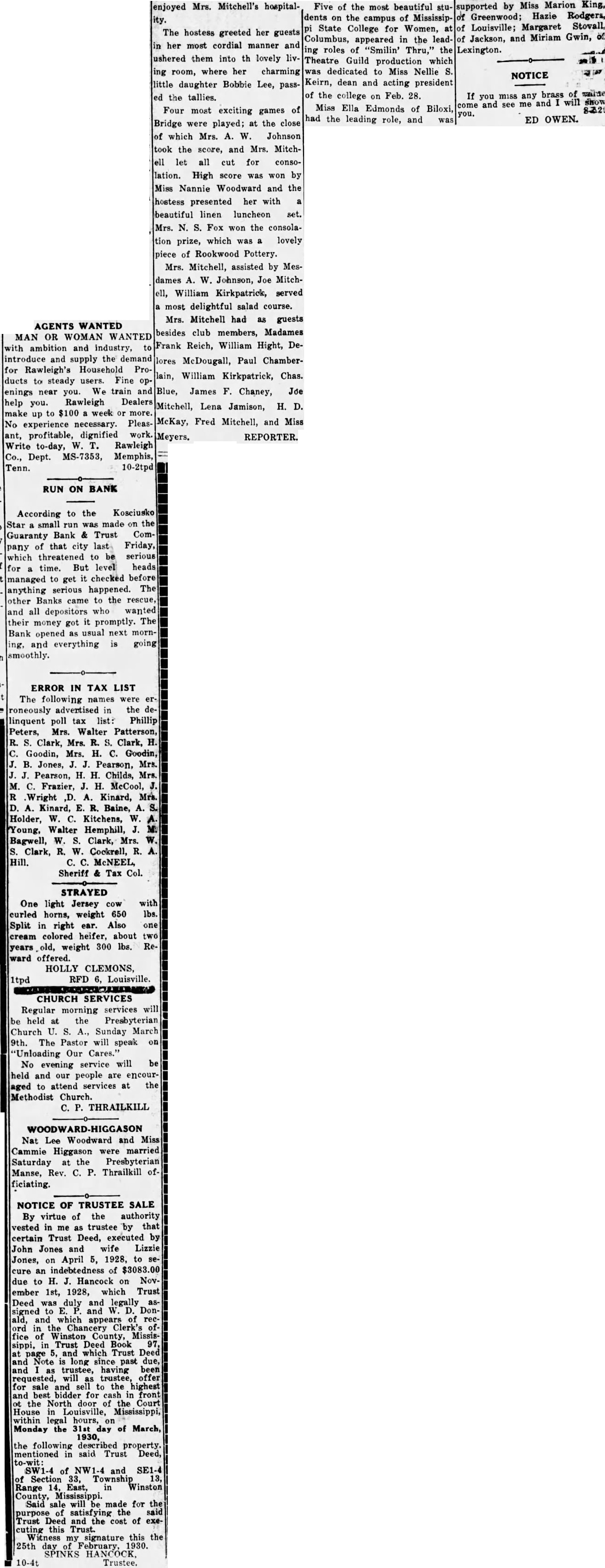 AGENTS WANTED MAN OR WOMAN WANTED with ambition and industry, to introduce and supply the demand for Rawleigh's Household Products to steady users. Fine openings near you. We train and help you. Rawleigh Dealers make up to $100 a week or more. No experience necessary. Pleasant, profitable, dignified work. Write to-day, W. T. Rawleigh Co., Dept. MS-7353, Memphis, Tenn. 10-2tpd RUN ON BANK According to the Kosciusko Star a small run was made on the Guaranty Bank & Trust Company of that city last Friday, which threatened to be serious for a time. But level heads managed to get it checked before anything serious happened. The other Banks came to the rescue, and all depositors who wanted their money got it promptly. The Bank opened as usual next morning, and everything is going smoothly. ERROR IN TAX LIST The following names were erroneously advertised in the delinquent poll tax list: Phillip Peters, Mrs. Walter Patterson, R. S. Clark, Mrs. R. S. Clark, H. C. Goodin, Mrs. H. C. Goodin, J. B. Jones, J. J. Pearson, Mrs. J. J. Pearson, H. H. Childs, Mrs. M. C. Frazier, J. H. McCool, J. R Wright ,D. A. Kinard, Mrs. D. A. Kinard, E. R. Baine, A. S. Holder, W. C. Kitchens, W. A. Young, Walter Hemphill, J. M. Bagwell, W. S. Clark, Mrs. W. S. Clark, R. W. Cockrell, R. A. Hill. C. C. McNEEL, Sheriff & Tax Col. STRAYED One light Jersey cow with curled horns, weight 650 lbs. Split in right ear. Also one cream colored heifer, about two years old, weight 300 lbs. Reward offered. HOLLY CLEMONS, 1tpd RFD 6, Louisville. CHURCH SERVICES Regular morning services will be held at the Presbyterian Church U. S. A., Sunday March 9th. The Pastor will speak on "Unloading Our Cares." No evening service will be held and our people are encouraged to attend services at the Methodist Church. C. P. THRAILKILL enjoyed Mrs. Mitchell's hospitality. The hostess greeted her guests in her most cordial manner and ushered them into th lovely living room, where her charming little daughter Bobbie Lee, passed the tallies. Four most exciting games of Bridge were played; at the close of which Mrs. A. W. Johnson took the score, and Mrs. Mitchell let all cut for consolation. High score was won by Miss Nannie Woodward and the hostess presented her with a beautiful linen luncheon set. Mrs. N. S. Fox won the consolation prize, which was a lovely piece of Rookwood Pottery. Mrs. Mitchell, assisted by Mesdames A. W. Johnson, Joe Mitchell, William Kirkpatrick, served a most delightful salad course. Mrs. Mitchell had as guests besides club members, Madames Frank Reich, William Hight, De- lores McDougall, Paul Chamber- lain, William Kirkpatrick, Chas. Blue, James F. Chaney, Joe Mitchell, Lena Jamison, H. D. McKay, Fred Mitchell, and Miss Meyers. REPORTER. Five of the most beautiful students on the campus of Mississippi State College for Women, at Columbus, appeared in the leading roles of "Smilin' Thru," the Theatre Guild production which was dedicated to Miss Nellie S. Keirn, dean and acting president supported by Miss Marion King, of Greenwood; Hazie Rodgers, of Louisville; Margaret Stovall of Jackson, and Miriam Gwin, of Lexington. of the college on Feb. 28. If you miss any brass of walse come and see me and will 8-22t show Miss Ella Edmonds of Biloxi, you. had the leading role, and was ED OWEN. WOODWARD-HIGGASON Nat Lee Woodward and Miss Cammie Higgason were married Saturday at the Presbyterian Manse, Rev. C. P. Thrailkill officiating. NOTICE OF TRUSTEE SALE By virtue of the authority vested in me as trustee by that certain Trust Deed, executed by John Jones and wife Lizzie Jones, on April 5, 1928, to secure an indebtedness of $3083.00 due to H. J. Hancock on November 1st, 1928, which Trust Deed was duly and legally assigned to E. P. and W. D. Donald, and which appears of record in the Chancery Clerk's office of Winston County, Mississippi, in Trust Deed Book 97, at page 5, and which Trust Deed and Note is long since past due, and I as trustee, having been requested, will as trustee, offer for sale and sell to the highest and best bidder for cash in front at the North door of the Court House in Louisville, Mississippi, within legal hours, on Monday the 31st day of March, 1930, the following described property. mentioned in said Trust Deed, to-wit: SW1-4 of NW1-4 and SE1-4 of Section 33, Township 13, Range 14, East, in Winston County, Mississippi. Said sale will be made for the purpose of satisfying the said Trust Deed and the cost of executing this Trust. Witness my signature this the 25th day of February, 1930. SPINKS HANCOCK. 10-4t Trustee.