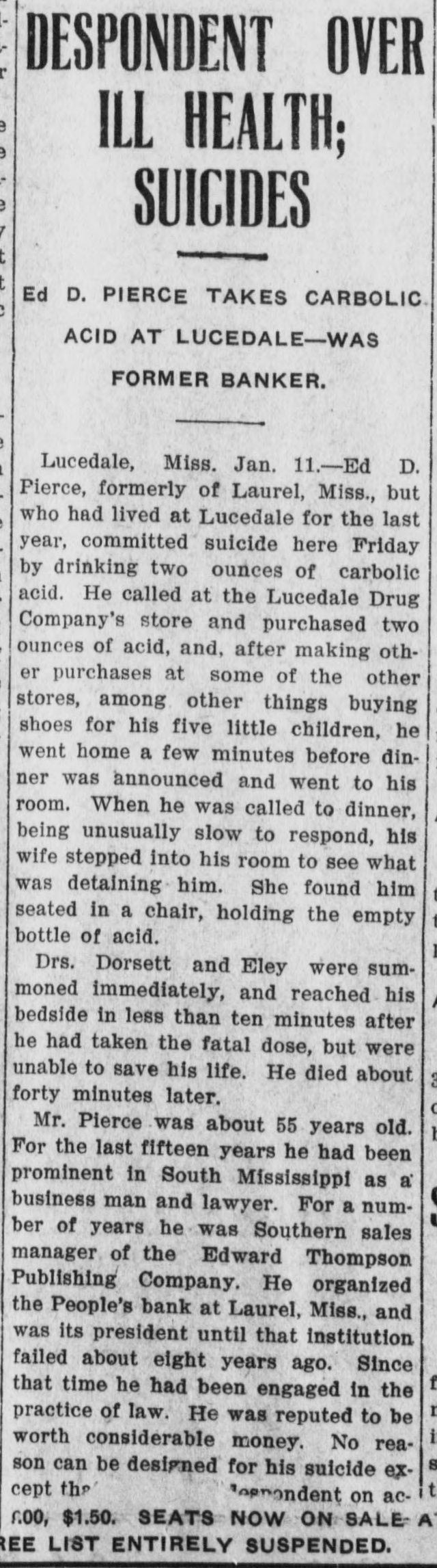 DESPONDENT OVER ILL HEALTH; SUICIDES Ed D. PIERCE TAKES CARBOLIC ACID AT LUCEDALE-WAS FORMER BANKER. Lucedale, Miss. Jan. 11.-Ed D. Pierce, formerly of Laurel, Miss., but who had lived at Lucedale for the last year, committed suicide here Friday by drinking two ounces of carbolic acid. He called at the Lucedale Drug Company's store and purchased two ounces of acid, and, after making other purchases at some of the other stores, among other things buying shoes for his five little children, he went home a few minutes before dinner was announced and went to his room. When he was called to dinner, being unusually slow to respond, his wife stepped into his room to see what was detaining him. She found him seated in a chair, holding the empty bottle of acid. Drs. Dorsett and Eley were summoned immediately, and reached his bedside in less than ten minutes after he had taken the fatal dose, but were unable to save his life. He died about 3 forty minutes later. C Mr. Pierce was about 55 years old. For the last fifteen years he had been prominent in South Mississippi as a business man and lawyer. For a number of years he was Southern sales manager of the Edward Thompson Publishing Company. He organized the People's bank at Laurel, Miss., and was its president until that institution failed about eight years ago. Since f that time he had been engaged in the practice of law. He was reputed to be worth considerable money. No reaS son can be designed for his suicide except the reepondent on ac0.00, $1.50. SEATS NOW ON SALE A EE LIST ENTIRELY SUSPENDED.