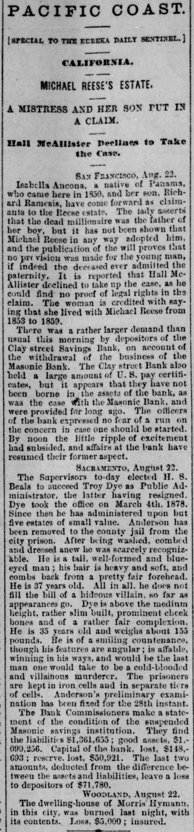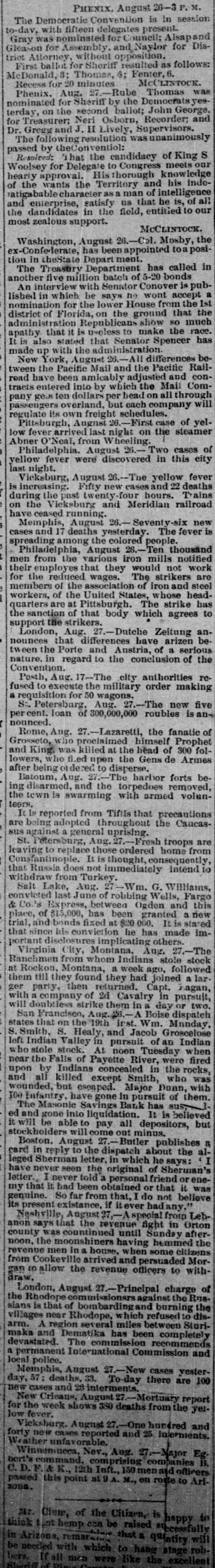 Phenix, Aug. 27. Rube Thomas was nominated for Sheriff by the Democrats yesterday, on the second ballot; John George, for Treasurer; Neri Osborn, Recorder; and Dr. Gregg and J. H Lively, Supervisors.