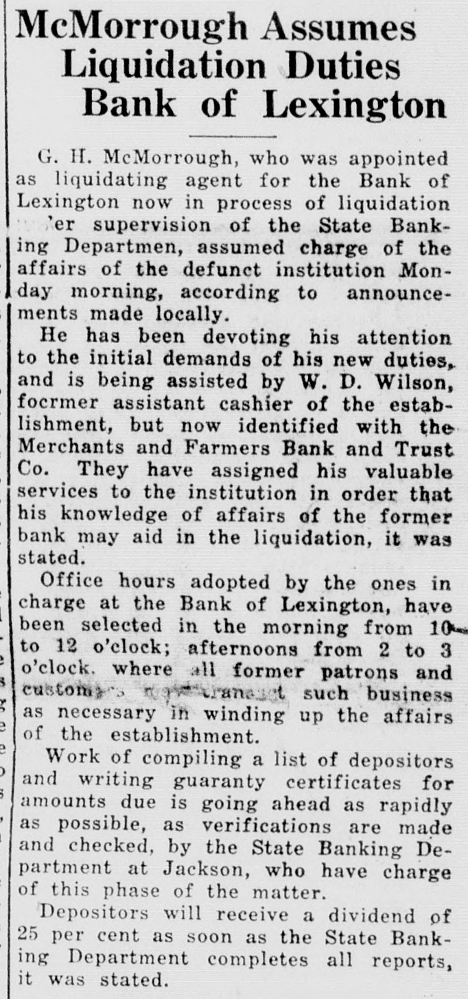 McMorrough Assumes Liquidation Duties Bank of Lexington G. H. McMorrough, who was appointed as liquidating agent for the Bank of Lexington now in process of liquidation 'er supervision of the State Banking Departmen, assumed charge of the affairs of the defunct institution Monday morning, according to announcements made locally. He has been devoting his attention to the initial demands of his new duties, and is being assisted by W. D. Wilson, forrmer assistant cashier of the establishment, but now identified with the Merchants and Farmers Bank and Trust Co. They have assigned his valuable services to the institution in order that his knowledge of affairs of the former bank may aid in the liquidation, it was stated. Office hours adopted by the ones in charge at the Bank of Lexington, have been selected in the morning from 10 to 12 o'clock; afternoons from 2 to 3 o'clock. where all former patrons and custom transict such business as necessary in winding up the affairs of the establishment. Work of compiling a list of depositors and writing guaranty certificates for amounts due is going ahead as rapidly as possible, as verifications are made and checked, by the State Banking Department at Jackson, who have charge of this phase of the matter. Depositors will receive a dividend of 25 per cent as soon as the State Banking Department completes all reports, it was stated.