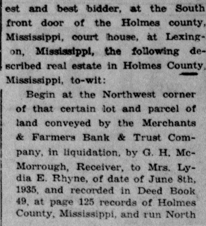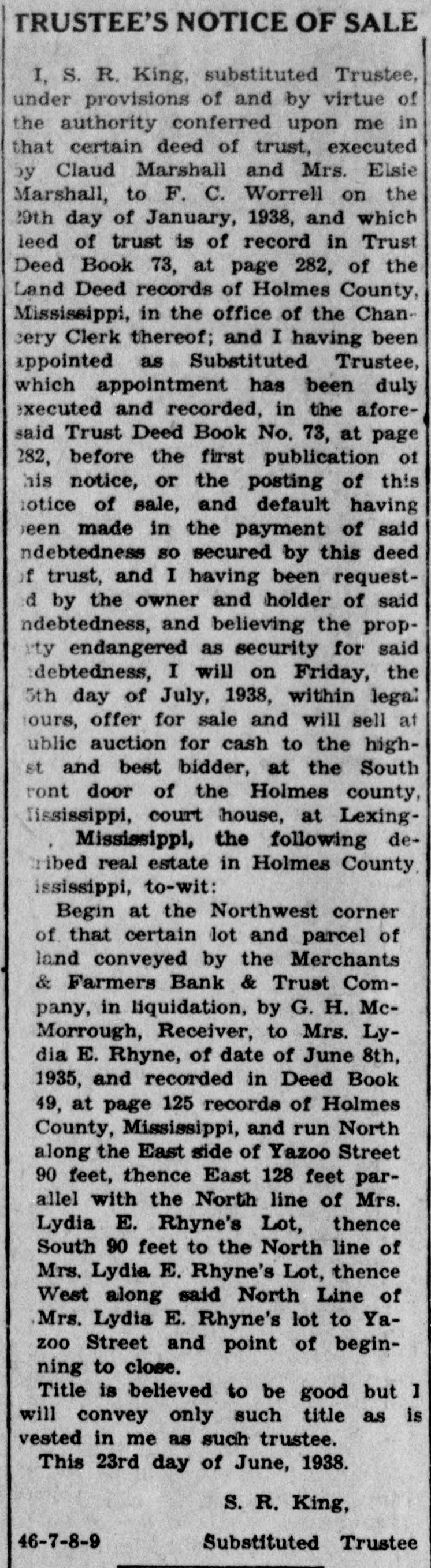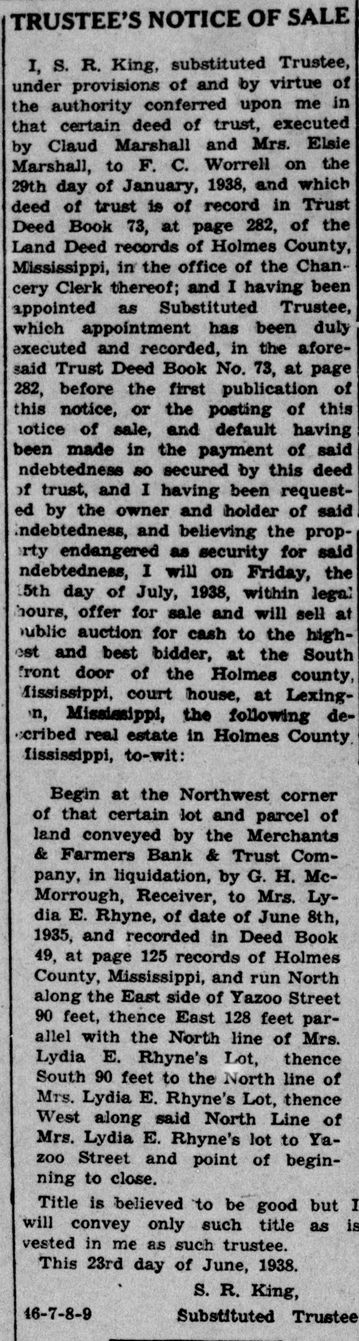 TRUSTEE'S NOTICE OF SALE I, S. R. King, substituted Trustee, under provisions of and by virtue of the authority conferred upon me in that certain deed of trust, executed by Claud Marshall and Mrs. Elsie Marshall, to F. C. Worrell on the 29th day of January, 1938, and which deed of trust is of record in Trust Deed Book 73, at page 282, of the Land Deed records of Holmes County, Mississippi, in the office of the Chancery Clerk thereof; and I having been appointed as Substituted Trustee, which appointment has been duly executed and recorded, in the aforesaid Trust Deed Book No. 73, at page 282, before the first publication of this notice, or the posting of this notice of sale, and default having been made in the payment of said ndebtedness so secured by this deed of trust, and I having been requested by the owner and holder of said Indebtedness, and believing the proprty endangered as security for said ndebtedness, I will on Friday, the 5th day of July, 1938, within legal hours, offer for sale and will sell at public auction for cash to the highest and best bidder, at the South front door of the Holmes county, Mississippi, court house, at Lexingn, Mississippi, the following decribed real estate in Holmes County. fississippi, to-wit: Begin at the Northwest corner of that certain lot and parcel of land conveyed by the Merchants & Farmers Bank & Trust Company, in liquidation, by G. H. McMorrough, Receiver, to Mrs. Lydia E. Rhyne, of date of June 8th, 1935, and recorded in Deed Book 49, at page 125 records of Holmes County, Mississippi, and run North along the East side of Yazoo Street 90 feet, thence East 128 feet parallel with the North line of Mrs. Lydia E. Rhyne's Lot, thence South 90 feet to the North line of Mrs. Lydia E. Rhyne's Lot, thence West along said North Line of Mrs. Lydia E. Rhyne's lot to YaZOO Street and point of beginning to close. Title is believed to be good but I will convey only such title as is vested in me as such trustee. This 23rd day of June, 1938. S. R. King, 16-7-8-9 Substituted Trustee