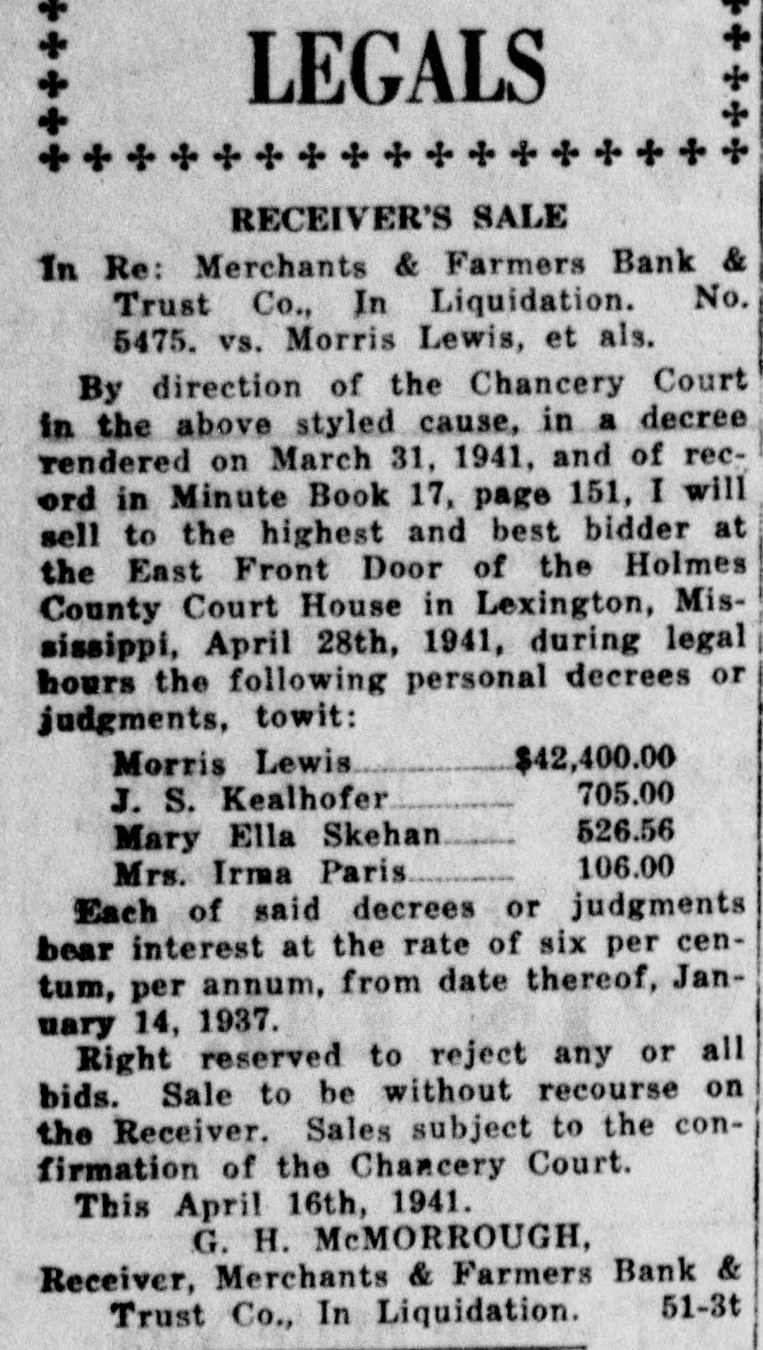 LEGALS RECEIVER'S SALE In Re: Merchants & Farmers Bank & Trust Co., In Liquidation. No. 5475. vs. Morris Lewis, et als. By direction of the Chancery Court in the above styled cause, in a decree rendered on March 31, 1941, and of record in Minute Book 17, page 151, I will sell to the highest and best bidder at the East Front Door of the Holmes County Court House in Lexington, Mississippi, April 28th, 1941, during legal hours the following personal decrees or judgments, towit: $42,400.00 Morris Lewis 705.00 J. S. Kealhofer 526.56 Mary Ella Skehan 106.00 Mrs. Irma Paris Each of said decrees or judgments bear interest at the rate of six per centum, per annum, from date thereof, January 14, 1937. Right reserved to reject any or all bids. Sale to be without recourse on the Receiver. Sales subject to the confirmation of the Chancery Court. This April 16th, 1941. G. H. McMORROUGH, Receiver, Merchants & Farmers Bank & 51-3t Trust Co., In Liquidation.