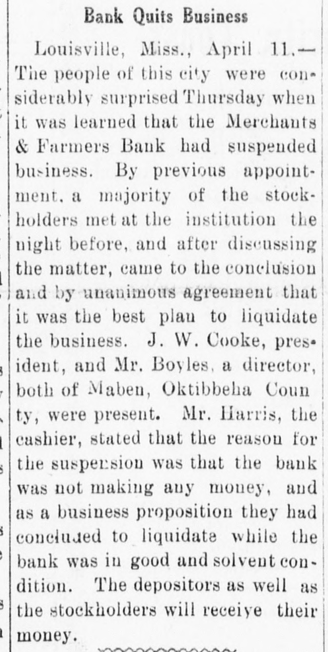 Bank Quits Business Louisville, Miss., April 11.The people of this city were con siderably surprised Thursday when it was learned that the Merchants & Farmers Bank had suspended business. By previous appointment. a majority of the stockholders met at the institution the night before, and after discussing the matter, came to the conclusion and by unanimous agreement that it was the best plan to liquidate the business. J. W. Cooke, pres. ident, and Mr. Boyles, a director, both of Maben, Oktibbeha Coun ty, were present. Mr. Harris, the cashier, stated that the reason for the suspension was that the bank was not making any money, and as a business proposition they had concluded to liquidate while the bank was in good and solvent condition. The depositors as well as the stockholders will receive their money.