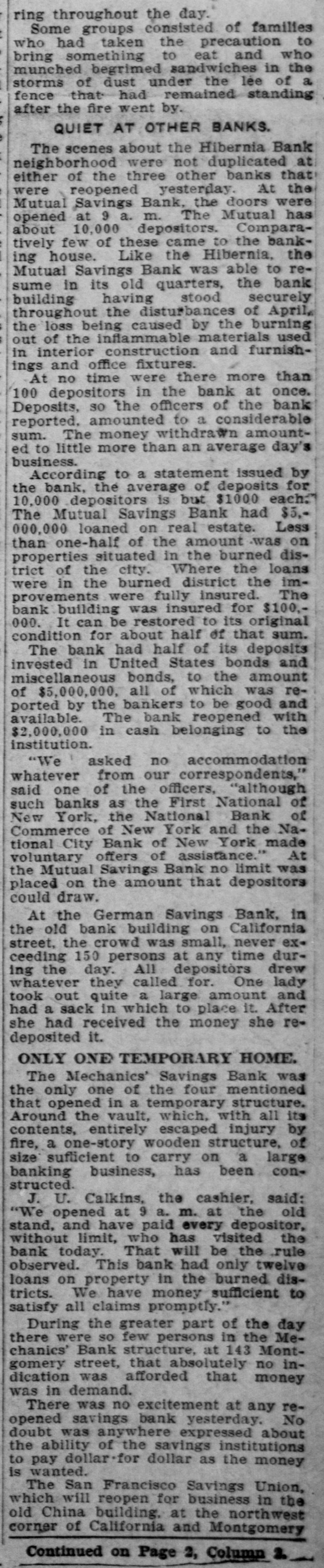 ring throughout the day. Some groups consisted of families who had taken the precaution to bring something to eat and who munched begrimed sandwiches in the a storms of dust under the lée of fence that had remained standing after the fire went by. QUIET AT OTHER BANKS. The scenes about the Hibernia Bank neighborhood were not duplicated at either of the three other banks that the were reopened yesterday. At Mutual Savings Bank, the doors were has opened at 9 a. m. The Mutual about 10,000 depositors. Comparafew of these came to the bank- the ing tively house. Like the Hibernia, Mutual Savings Bank was able to resume in its old quarters, the bank building having stood securely throughout the disturbances of April, loss being caused by the burning used the of the inflammable materials in out interior construction and furnishings and office fixtures. At no time were there more than depositors in the bank at once. 100 Deposits, so the officers of the bank reported. amounted to a considerable The money withdrawn amountsum. ed to little more than an average day's business. According to a statement issued for by bank, the average of deposits each." the 10,000 depositors is but $1000 The Mutual Savings Bank had $5.000,000 loaned on real estate. Less than one-half of the amount was dis- on properties situated in the burned loans of the city. Where the imtrict in the burned district the The were provements were fully insured. $100,building was insured for bank It can be restored to its original 000. condition for about half of that sum. The bank had half of its deposits invested in United States bonds and miscellaneous bonds, to the amount re$5,000,000, all of which was and of by the bankers to be good with ported available. The bank reopened the $2,000,000 in cash belonging to institution. "We asked no accommodation whatever from our correspondents." one of the officers, "although of said banks as the First National of such York, the National Bank NaNew of New York and the tional Commerce City Bank of New York made At voluntary offers of assistance." Mutual Savings Bank no limit was placed the on the amount that depositors could draw. the German Savings Bank, in At old bank building on California street, the the crowd was small, never dur- ex150 persons at any time drew ceeding the day. All depositors lady ing whatever they called for. One and out quite a large amount After had took a sack in which to place it. she had received the money she redeposited it. ONLY ONE TEMPORARY HOME. The Mechanics' Savings Bank was only one of the four mentioned the opened in a temporary structure. all its that the vault, which, with by contents, Around entirely escaped injury of fire, a one-story wooden structure, size suflicient to carry on a large banking business, has been constructed. U. Calkins, the cashier, said: old J. opened at 9 a. m. at the 'We and have paid every depositor, the stand, without limit, who has visited today. That will be the rule observed. bank This bank had only twelve on property in the burned dis- to loans tricts. We have money sufficient satisfy all claims promptly. During the greater part of the Me- day were so few persons in the there Bank structure, at 143 Mont- inchanics' street, that absolutely no dication gomery was afforded that money was in demand. There was no excitement at any re- No opened savings bank yesterday. about doubt was anywhere expressed ability of the savings institutions to the pay dollar+for dollar as the money is wanted. The San Francisco Savings Union, which will reopen for business in the China building. at the northwest old corner of California and Montgomery Continued on Page 2, Column 2.