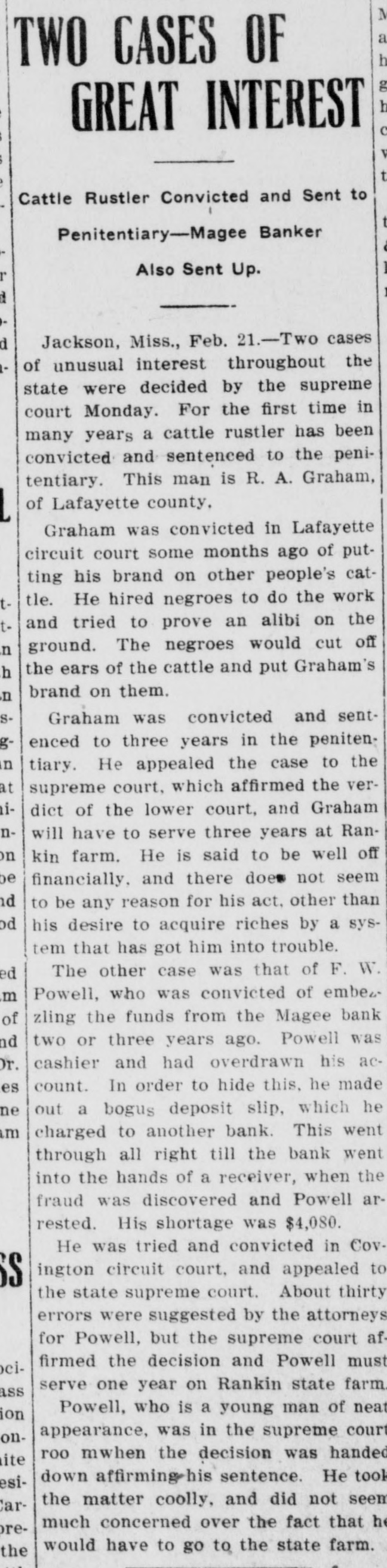 a h TWO CASES OF GREAT INTEREST Cattle Rustler Convicted and Sent to Penitentiary-Magee Banker Also Sent Up. Jackson, Miss., Feb. 21.-Two cases of unusual interest throughout the state were decided by the supreme court Monday. For the first time in many years a cattle rustler has been convicted and sentenced to the penitentiary. This man is R. A. Graham, of Lafayette county. Graham was convicted in Lafayette circuit court some months ago of putting his brand on other people's cattle. He hired negroes to do the work and tried to prove an alibi on the In ground. The negroes would cut off the ears of the cattle and put Graham's h brand on them. n SGraham was convicted and sentgenced to three years in the penitenn tiary. He appealed the case to the at supreme court, which affirmed the veridict of the lower court, and Graham nwill have to serve three years at Ranon kin farm. He is said to be well off be financially, and there doe not seem d to be any reason for his act, other than od his desire to acquire riches by a system that has got him into trouble. The other case was that of F. W. ed m Powell, who was convicted of embezof zling the funds from the Magee bank two or three years ago. Powell was nd cashier and had overdrawn his acDr. count. In order to hide this, he made es ne out a bogus deposit slip, which he m charged to another bank. This went through all right till the bank went into the hands of a receiver, when the fraud was discovered and Powell arrested. His shortage was $4,080. He was tried and convicted in Covington circuit court. and appealed to SS the state supreme court. About thirty errors were suggested by the attorneys for Powell, but the supreme court affirmed the decision and Powell must ciserve one year on Rankin state farm ass Powell, who is a young man of neat ion appearance, was in the supreme court onroo mwhen the decision was handed ite down affirming his sentence. He tool esithe matter coolly, and did not seen Carmuch concerned over the fact that h prewould have to go to the state farm. the