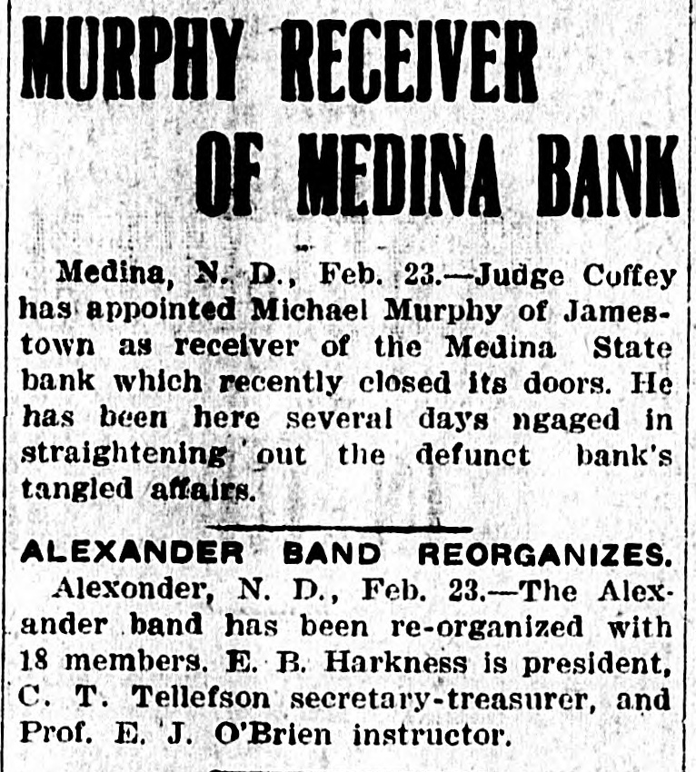 schedules which contain no items. For the first time farm fences, fall plowing, property of secret societies, household pets and scores of other items will be assessed this year. No longer will property owners be able to give a "lump sum" to the assessor. Every item has to be listed at 25 per cent of a fair market value, except moneys and credits, which go in at 5 per cent. John Roland of Stanley will be compelled to face the charge of first de gree murder as the result of the death of Harry Wolcott. His wife also is accused as being an accessory to the crime. The charge of murder was placed against Roland after the board of insanity commissioners had investigated Roland's mental condition and declared him sane. At the preliminary examination before O. M. Kline both Roland and his wife were bound over for trial. Bail was refused. Mrs. Irene Puarie of Slim Buttes was accidentally shot and killed by a young homesteader for whom she had been caring during an illness. The patient and another young man had quarreled during the day and in the evening, when the homesteader was aroused from sleep by a noise just outside the door of his home, he demanded to know who was there. Receiving no answer, and thinking it was the man with whom he had quarreled, he shot through the door and killed Hrs. Puarie. The coroner's jury exonerated him. The payment of $8,000 by the Consolidated Elevator company of Duluth to W. H. Stutsman, chairman of the North Dakota railway commission, saved the holders of $25,000 worth of storage tickets, issued at Davey and Walum, by the North Dakota Grain company, from losses, it was an nounced. The payment was made under the provisions of the law that the purchaser of stored grain must make good to storage ticket holders. The North Dakota commission traced the grain sold by the North Dakota Grain company to the Consolidated Grain company and the latter institution paid up. Thursday, Friday and Saturday, May 18, 19 and 20, have been selected for the annual North Dakota high school conference, athletic meet and debating and declamatory contest to be held at the state university in Grand Forks. The first day will be given over to the high school conference proper. Friday forenoon Inspector R. R. Edwards will conduct a round table on topics relating to smaller high schools. The athletic field tryouts will be held Friday and the finals on Saturday. The debating contest will take place Friday evening, when the state championship will be settled. On Friday evening the state declamation contest will be held. Twenty thousand coyotes have been slaughtered in the past year, according to the bounty statistics given out by Carl O. Jorgenson, state auditor. The auditor has just completed payment of $50,000 in bounties to the slayers of the coyotes. There was some' irregularity" in the bounty fund, brought about by a legislative transfer of a portion of the money previously levied for wolf bounty purposes, and that fact was responsible for the inability of the state to make payment for the past year, until the present time, the funds now being available through the collection of new taxes. The state pays a bounty of $2.50 for each wolf killed. The crack squad of the cadet battalion of the North Dakota Agricultural college will again go on the vaudeville stage this coming summer, making a tour of approximately 3,000 miles, and this time going through the East. The squad, which scored such a hit at all theaters where it showed last summer through the West, will leave Fargo immediately after the college closes in June. The tour will open in New York, where the equad will show for three consecutive weeks. The tour will then take it to Providence, Boston, Philadelphia, Baltimore, Washington and other important centers in the East. The tour will take thirteen weeks, all told. Judge C. A. Pollock at Fargo has ordered the dismissal of the action launched by the receiver of the Medina State bank against Governor L. B. Hanna, E. J. Weiser of Fargo and the First National bank of Fargo. Judge Pollock's dismissal on a demur rer to the complaint was on the find ing that the plaintiff failed to state any cause for action. Its demand for $50,000 for paper which it asserted was removed from the bank just before it was closed was held unjustified. The court holds that on his own pleadings the bank receiver has no cause for action Certain contracts