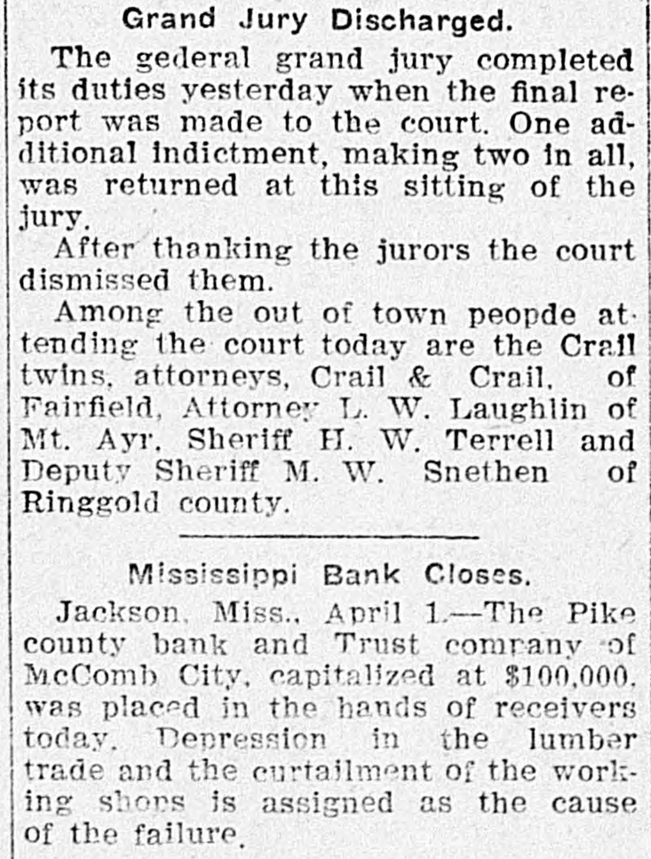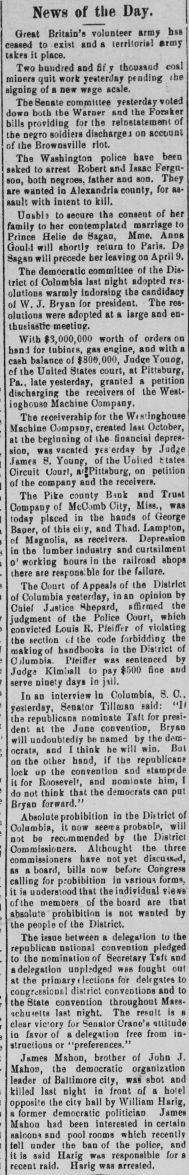News of the Day. Great Britain's volunteer army has ceased to exist and & territorial army takes it place. Two hundred and fif y thousand coal miners quit work yesterday pending the signing of a new wage acale. The Senate committee yesterday voted down both the Warner and the Foraker bills providing for the reinstatement of the negro soldiers discharge 1 on account of the Brownsville riot. The Washington police have been asked to arrest Robert and Isaac Ferguson, both negroes, father and son. They are wanted in Alexandria county, for assault with intent to kill. Unable to secure the consent of her family to her contemplated marriage to Prince Helie de Sagan, Mme. Anna Gould will shortly return to Paris. De Sagan will precede her leaving on April 9. The democratic committee of the District of Columbia last night adopted res. olutions warmly indorsing the candidacy of W. J. Bryan for president. The resolutions were adopted at a large and enthusiastic meeting. With $3,000,000 worth of orders on hand for tubines, gas engine, and with a cash balance of $800,000, Judge Young, of the United States court, at Pittsburg, Pa., late yesterday, granted a petition discharging the receivers of the Westioghouse Machine Company. The receivership for the Westinghouse Machine Company, created last October, at the beginning of the financial depression, was vacated yes erday by Judge James S. Young, of the United States Circuit Court, adPittsburg, on petition of the company and the receivers. The Pike county Bink and Trust Company of McComb City, Miss., was today placed in the hands of George Bauer, of this city, and Thad. Lampton, of Magnolia, as receivers. Depression in the lumber industry and curtailment o' working hours in the railroad shops there are responsible for the failure. The Court of Appeals of the District of Columbia yesterday, in an opinion by Chief Justice Shepard, affirmed the judgment of the Police Court, which convicted Louis R. Pfeiffer of violating the section of the code forbidding the making of handbooks in the District of Columbia. Pfeiffer was sentenced by Judge Kimball to pay $500 fine and serve ninety days in jail. In an interview in Columbia, S. C., yesterday, Senator Tillman said: "It the republicans nominate Taft for president at the June convention, Bryan will undoubtedly be named by the democrats, and I think he will win. But on the other hand, if the republicane lock up the convention and stampede it for Roosevelt, and nominate him, I do not think that the democrats can put Bryan forward." Absolute probibition in the District of Columbia, it now seems probable, will not be recommended by the District Commissioners. Althought the three commissioners have not yet discussed, as a board, bills now before Congress calling for probibition in various forms, it is understood that the individual views of the members of the board are that absolute prohibition is not wanted by the people of the District. The issue between a delegation to the republican national convention pledged to the nomination of Secretary Taft and a delegation unpledged W88 fought out at the primary lections for delegates to congressional district conventions and to the State convention throughout Massachu3etts last night. The result is 8 clear victory for Senator Crane's attitude in favor of a delegation free from instructions or "preferences." James Mahon, brother of John J. Mahon, the democratic organization leader of Baltimore city, was shot and killed last night in front of a hotel opposite the city hall by William Harig, a former democratic politician James Mahon had been interested in certain saloons and pool rooms which recently tell under the ban of the police, and it is said Harig Was responsible for a