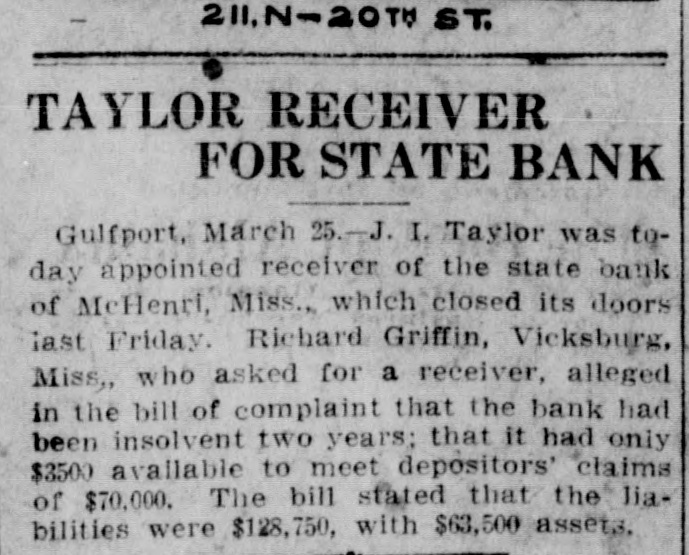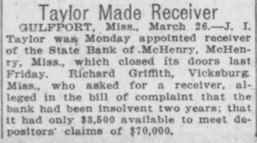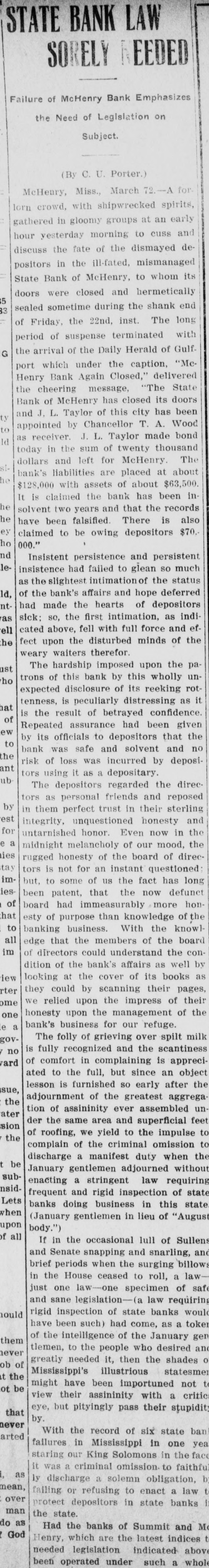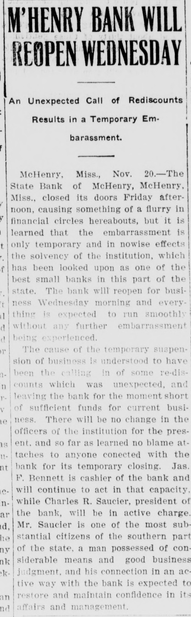 M'HENRY BANK WILL REOPEN WEDNESDAY An Unexpected Call of Rediscounts Results in a Temporary Embarassment. McHenry, Miss., Nov. 20.-The State Bank of McHenry, McHenry, Miss., closed its doors Friday afternoon, causing something of a flurry in financial circles hereabouts, but it is learned that the embarrassment is only temporary and in nowise effects the solvency of the institution, which has been looked upon as one of the best small banks in this part of the state. The bank will reopen for business Wednesday morning and everything is expected to run smoothly without any further embarrassment being experienced. The cause of the temporary suspension of business is understood to have been the calling in of some re-discounts which was unexpected, and n leaving the bank for the moment short of sufficient funds for current busiV ness. There will be no change in the e officers of the institution for the present. and SO far as learned no blame atas taches to anyone conected with the nt bank for its temporary closing. Jas. F. Bennett is cashier of the bank and will continue to act in that capacity, ewhile Charles R. Saucier, president of nar the bank, will be in active charge. Mr. Saucier is one of the most subd, stantial citizens of the southern part he of the state, a man possessed of con ny siderable means and good business nk ck judgment, and his connection in an ac tive way with the bank is expected to restore and maintain confidence in its affairs and management. nd