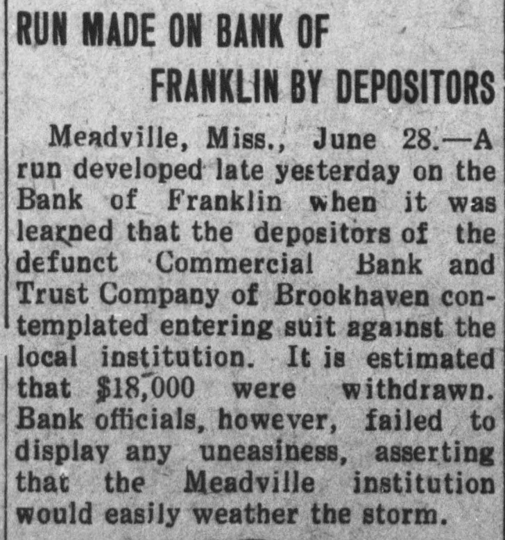 RUN MADE ON BANK OF FRANKLIN BY DEPOSITORS Meadville, Miss., June 28.-A I run developed late yesterday on the Bank of Franklin when it was learned that the depositors of the defunct Commercial Bank and Trust Company of Brookhaven contemplated entering suit against the local institution. It is estimated that $18,000 were withdrawn. Bank officials, however, failed to display any uneasiness, asserting that the Meadville institution would easily weather the storm.
