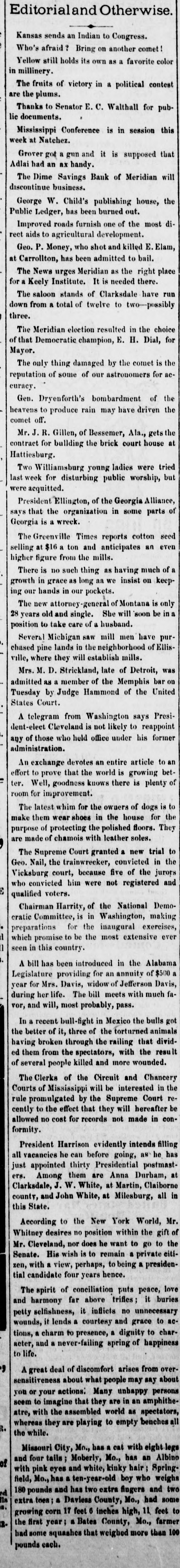 Editorial and Otherwise, Kansas sends an Indian to Congress. Who's afraid Bring on another comet Yellow still holds its own as favorite color in millinery. The fruits of victory in a political contest are the plums. Thanks to Senator E.C. Walthall for public documents. Mississippi Conference is in session this week at Natehez. Grover got gun and it is supposed that Adlai had an ax handy. The Dime Savings Bank of Meridian will discontinue business. Public George W. Child's publishing house, the Ledger, has been burned out. Improved roads furnish one of the most direct aids to agricultural development. Geo. P. Money, who shot and killed E. Elam, at Carrollton, has been admitted to bail. The News urges Meridian as the right place for Keely Institute. It is needed there. The saloon stands of Clarksdale have down from a total of twelve to two-possibly run three. The Meridian election resulted in the choice of that Democratic champion, E. H. Dial, for Mayor. The only thing damaged by the comet is the reputation of some of our astronomers for accuracy. heavens Gen. Dryenforth's bombardment of the to produce rain may have driven the comet off'. Mr. R. Gillen, of Bessemer, Ala., gets the contract for building the brick court house at Hattiesburg. Two Williamsburg young ladies were tried last week for disturbing public worship, but were acquitted. President Ellington, of the Georgia Alliance, says that the organization in some parts of Georgia wreck. The Greenville Times reports cotton seed selling at $16 ton and anticipates an even higher figure from the mills. There is no such thing as having much of growth in grace as long aa we insist on keeping our hands in our pockets. The new attorney -general of Montana is only 28 years old and single. She will soon be in a position to take care of husband. Several Michigan saw mill men have purchased pine lands in the neighborhood of Ellisville, where they will establish mills. was Mrs. M. D. Strickland, late of Detroit, admitted as member of the Memphis bar on Tuesday by Judge Hammond of the United States Court. A telegram from Washington says President-elect Cleveland not likely to reappoint any of those who held office under his former administration An exchange devotes an entire article to an effort to prove that the world is growing better. Well, goodness knows there is plenty of room for improvement. The latest whim for the owners of dogs is to make them wear shoes in the house for the purpose of protecting the polished floors. They 0 are made of chamois with leather soles. The Supreme Court granted a new trial to Geo. Nail, the trainwrecker, convicted in the Vicksburg court, because five of the jurors E who convicted him were not registered and qualified voters. Chairman Harrity, of the National Democratic Committee, is in Washington, making preparations for the inaugural exercises, which promise to be the most extensive ever seen in this country. A bill has been introduced in the Alabama Legislature providing for an annuity of $500 year for Mrs. Davis, widow of Jefferson Davis, during her life. The bill meets with much favor, and will, most probably, pass. In recent bull-fight in Mexico the bulls the better of it, three of the torturned animals got having broken through the railing that divided them from the spectators, with the result of several people killed and more wounded. The Clerks of the Circuit and Chancery Courts of Mississippi will be interested in the rule promulgated by the Supreme Court recently to the effect that they will hereafter be allowed no cost for records not made in conformity. President Harrison evidently intends he can before as has thirty Presidential just ers. all vacancies appointed going, postmast- he filling Among them are Anna Durbam, at Clarksdale, J. W. White, at Martin, Claiborne county, and John White, at Milesburg, all in this State. According to the New York World, Mr. Whitney desires no position within the gift of Mr. Cleveland, nor does he want to go to the Senate. His wish is to remain a private zen, with view, perhaps, to being a presidential candidate four years hence. The spirit of conciliation puts peace, love and harmony far above trifles it buries petty selfishness, it indicts no unnecessary wounds, it lends courtesy and grace to actions, charm to presence, dignity to character, and never-failing spring of happiness to life. b A great deal of discomfort arises from oversensitiveness about what people may say about you or your actions: Many unhappy persons seem to imagine that they are in an amphitheatre, with the assembled world as spectators, whereas they are playing to empty benches R. the while. Missouri City, Mo., has cat with eight.legs of and four tails; Moberly, Mo., has an Albino with pink eyes and white, kinky hair: Springfield, Mo., a ten-year-old boy who weighs 180 pounds and has two extra fingers and two extra toes a Daviess County, Mo., had some growing corn 17 feet 6 inches high, 11 feet to the first year; a Bates County, Mo., farmer had some squashes that weighed more than 100 pounds each.