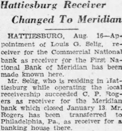 NEW BANK RECEIVER NAMED Meridian. Aug. Sehas been appointed by the comp. of currency succeed Rodgers of the old First National Bank Meridian Mr. Rodgers was Philadelphia, assume the of closed bank Mr. Selig also the defunct National Bank Hattiesburg and charge liquidating mainder securities both institutions.