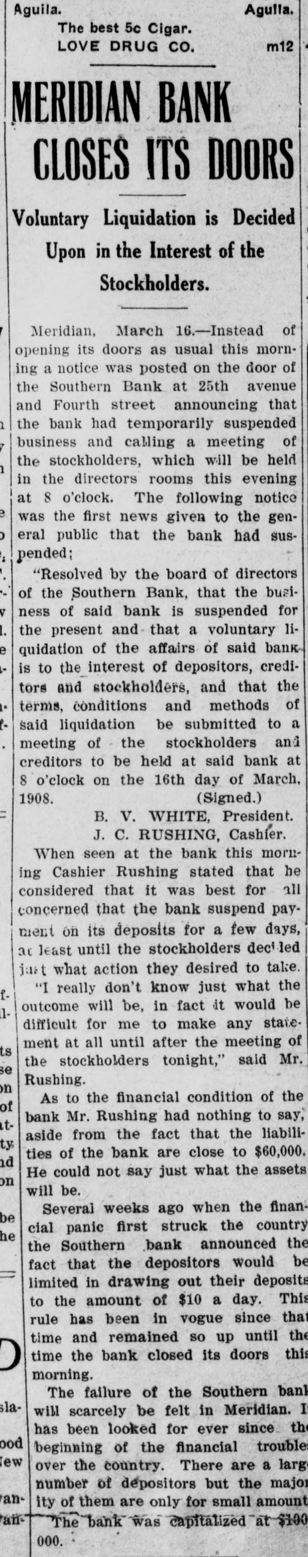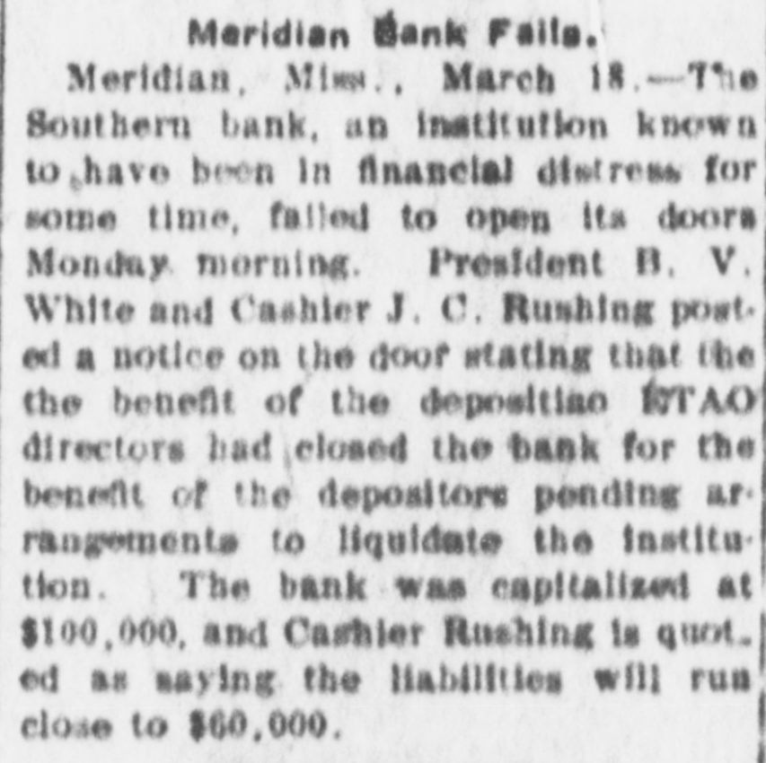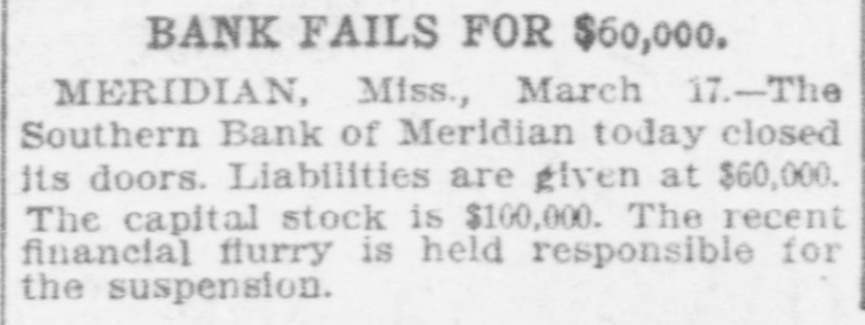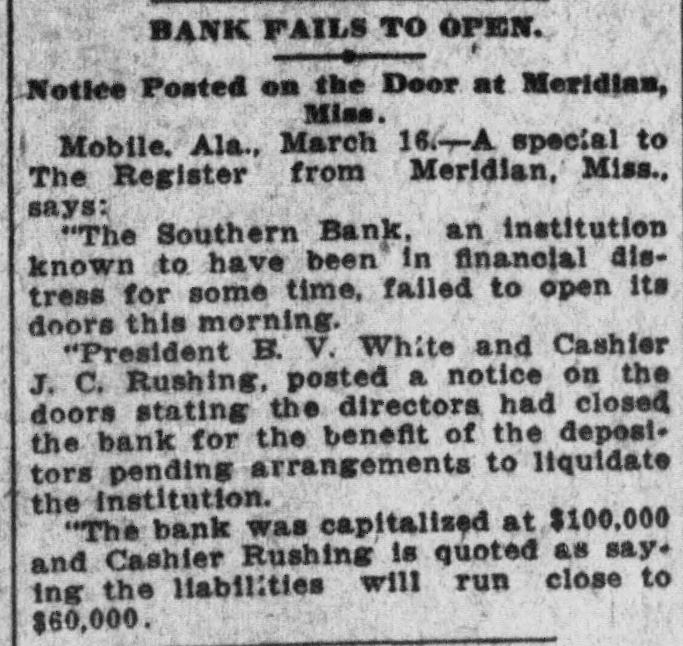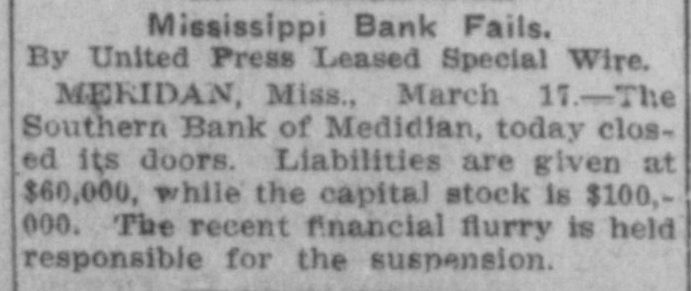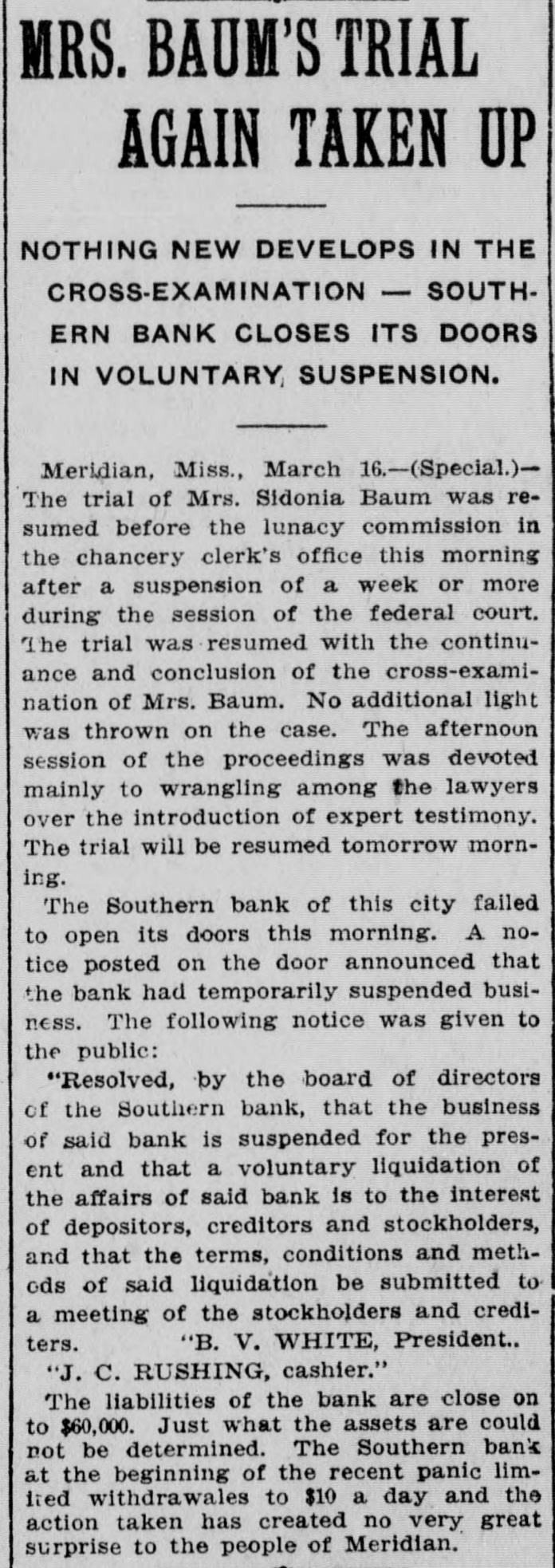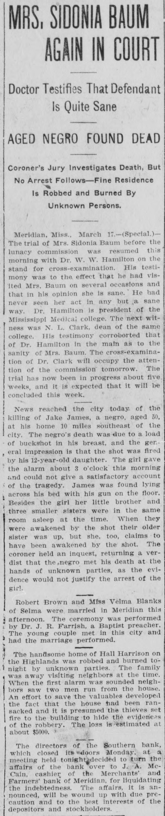 MRS, SIDONIA BAUM AGAIN IN COURT Doctor Testifies That Defendant Is Quite Sane AGED NEGRO FOUND DEAD Coroner's Jury Investigates Death, But No Arrest Follows-Fine Residence Is Robbed and Burned By Unknown Persons. Meridian, Miss., March 17.-(Special.)The trial of Mrs. Sidonia Baum before the lunacy commission was resumed this morning with Dr. W. W. Hamilton on the stand for cross-examination. His testimony was to the effect that he had visited Mrs. Baum on several occasions and that in his opinion she is sane. He had never seen her act in any but a sane way. Dr. Hamilton is president of the Mississippi Medical college. The next witness was N. L. Clark, dean of the same college. His testimony corroborted that of Dr. Hamilton in the main as to the sanity of Mrs. Baum. The cross-examination of Dr. Clark will occupy the attention of the commission tomorrow. The trial has now been in progress about five weeks, and it is expected that it will be concluded this week. News reached the city today of the killing of Jake James, a negro, aged 30, at his home 10 miles southeast of the city. The negro's death was due to a load of buckshot in his breast, and the general impression is that the shot was fired by his 12-year-old daughter. The girl gave the alarm about 3 o'clock this morning and could not give a satisfactory account of the tragedy. James was found lying across his bed with his gun on the floor. Besides the girl her little brother and three smaller sisters were in the same room asleep at the time. When they were awakened by the shot their older sister was up, but she, too, claims to have been awakened by the shot. The coroner held an inquest, returning a verdist that the negro met his death at the hands of unknown parties, as the evidence would not justify the arrest of the girl. Robert Brown and Miss Velma Blanks of Selma were married in Meridian this afternoon. The ceremony was performed by Dr. J. R. Farrish, a Baptist preacher. The young couple met in this city and had the marriage performed. The handsome home of Hall Harrison on the Highlands was robbed and burned tonight by unknown parties. The family was away visiting neighbors at the time, When the first alarm was sounded neighbors saw two men run from the house. An effort to save the valuables developed the fact that the house had been ransacked and it is presumed the thieves set fire to the building to hide the evidences of the robbery. The loss is estimated at about $5000. The directors of the Southern bank, which closed its <doors Monday, at a meeting held tonight>decided to turn the affairs of the bank over to J. A. McCain, cashier of the Merchants' and Farmers' bank of Meridian, for liquidating the indebtedness. The affairs, it is announced, will be wound up with due precaution and to the best interests of the depositors and stockholders.