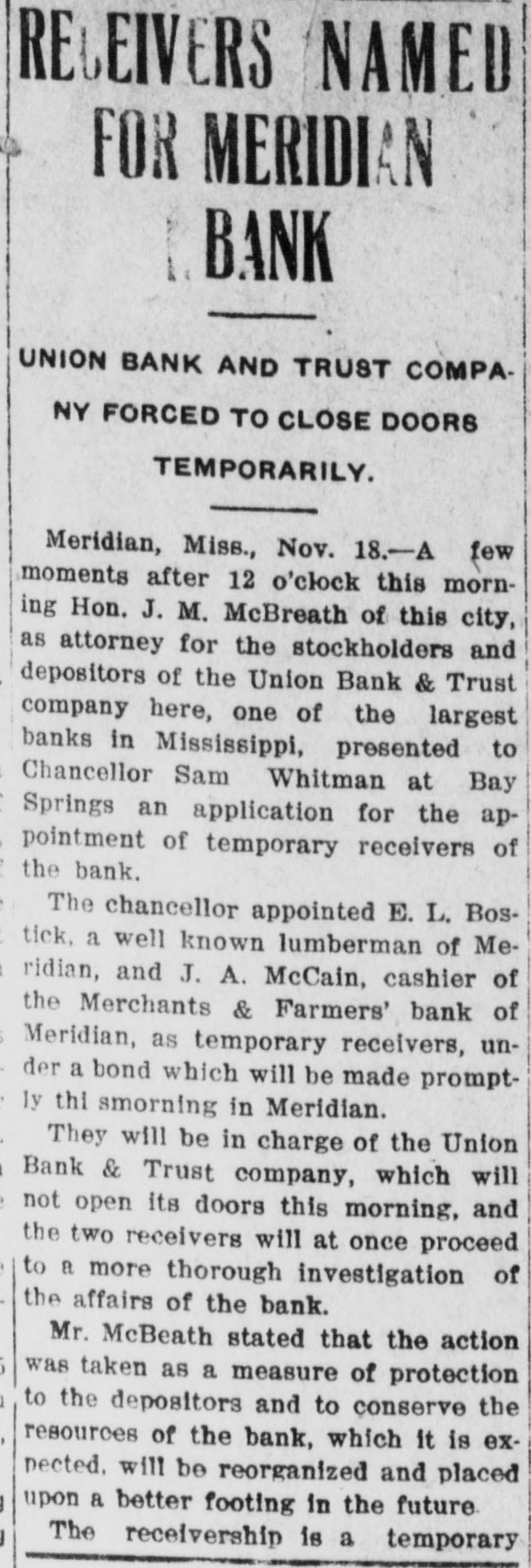RECEIVERS NAMED FOR MERIDIAN BANK UNION BANK AND TRUST COMPANY FORCED TO CLOSE DOORS TEMPORARILY. Meridian, Miss., Nov. 18.-A few moments after 12 o'clock this morning Hon. J. M. McBreath of this city, as attorney for the stockholders and depositors of the Union Bank & Trust company here, one of the largest banks in Mississippi, presented to Chancellor Sam Whitman at Bay Springs an application for the appointment of temporary receivers of the bank. The chancellor appointed E. L. Bostick, a well known lumberman of Meridian, and J. A. McCain, cashier of the Merchants & Farmers' bank of Meridian, as temporary receivers, under a bond which will be made promptly thi smorning in Meridian. They will be in charge of the Union Bank & Trust company, which will not open its doors this morning, and the two receivers will at once proceed to a more thorough investigation of the affairs of the bank. Mr. McBeath stated that the action was taken as a measure of protection to the depositors and to conserve the resources of the bank, which it is expected. will be reorganized and placed upon a better footing in the future. The receivership is a temporary