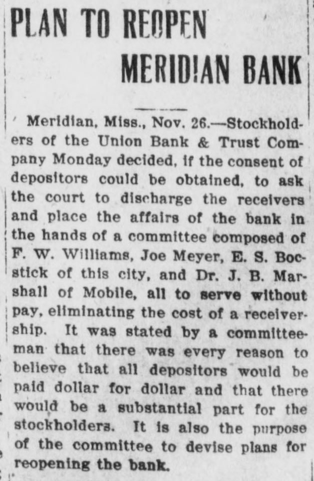 PLAN TO REOPEN MERIDIAN BANK Meridian, Miss., Nov. 26.-Stockholders of the Union Bank & Trust Company Monday decided, If the consent of depositors could be obtained, to ask the court to discharge the receivers and place the affairs of the bank in the hands of a committee composed of F. W. Williams, Joe Meyer, E. S. Bocstick of this city, and Dr. J. B. Marshall of Mobile, all to serve without pay, eliminating the cost of a receivership. It was stated by a committeeman that there was every reason to believe that all depositors would be paid dollar for dollar and that there would be a substantial part for the stockholders. It is also the purpose of the committee to devise plans for reopening the bank.