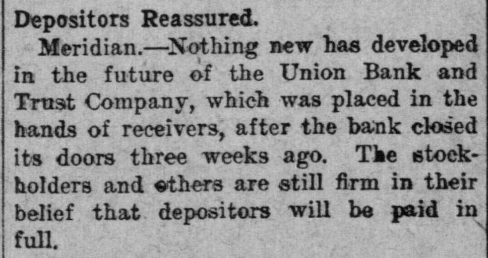 Depositors Reassured. Meridian.-Nothing new has developed in the future of the Union Bank and Trust Company, which was placed in the hands of receivers, after the bank closed its doors three weeks ago. The stockholders and others are still firm in their belief that depositors will be paid in full.