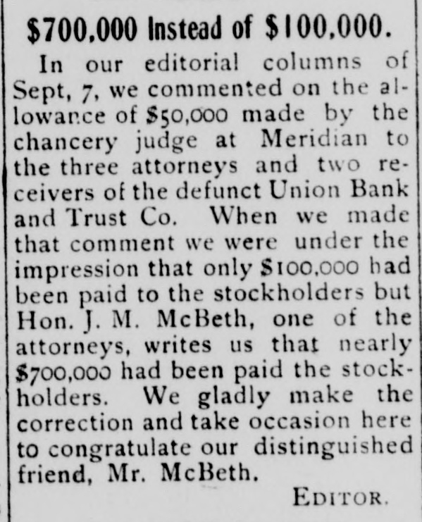 $700,000 Instead of $100,000. In our editorial columns of Sept, 7, we commented on the allowance of $50,000 made by the chancery judge at Meridian to the three attorneys and two receivers of the defunct Union Bank and Trust Co. When we made that comment we were under the impression that only $100,000 had been paid to the stockholders but Hon. J. M. McBeth, one of the attorneys, writes us that nearly $700,000 had been paid the stockholders. We gladly make the correction and take occasion here to congratulate our distinguished friend, Mr. McBeth. EDITOR.