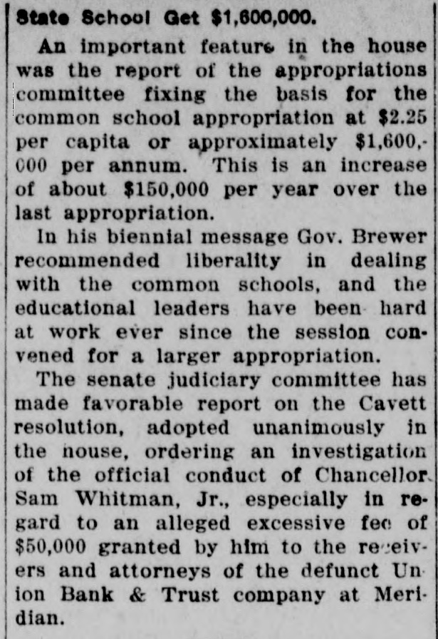 STATE SCHOOLS GIVEN $1,600,000 EVENTS IN STATE CAPITAL INCREASE APPROPRIATION REC. OMMENDED BY HOUSE COMMITTEE IN REPORT. Doings in the Various Departments of the Government of the Commonwealth Reported for Benefit of Our Readers. -Jackson. An important feature in the house was the report of the appropriations committee fixing the basis for the common school appropriation at $2.25 per capita or approximately $1,600,000 per annum. This is an increase of about $150,000 per year over the last appropriation. In his biennial message Gov. Brewer recommended liberality in dealing with the common schools, and the educational leaders have been hard at work ever since the session convened for a larger appropriation. The senate judiciary committee has made favorable report on the Cavett resolution, adopted unanimously in the house, ordering an investigation of the official conduct of Chancellor Sam Whitman, Jr., especially in regard to an alleged excessive fee of $50,000 granted by him to the receivers and attorneys of the defunct Union Bank & Trust company at Meridian.