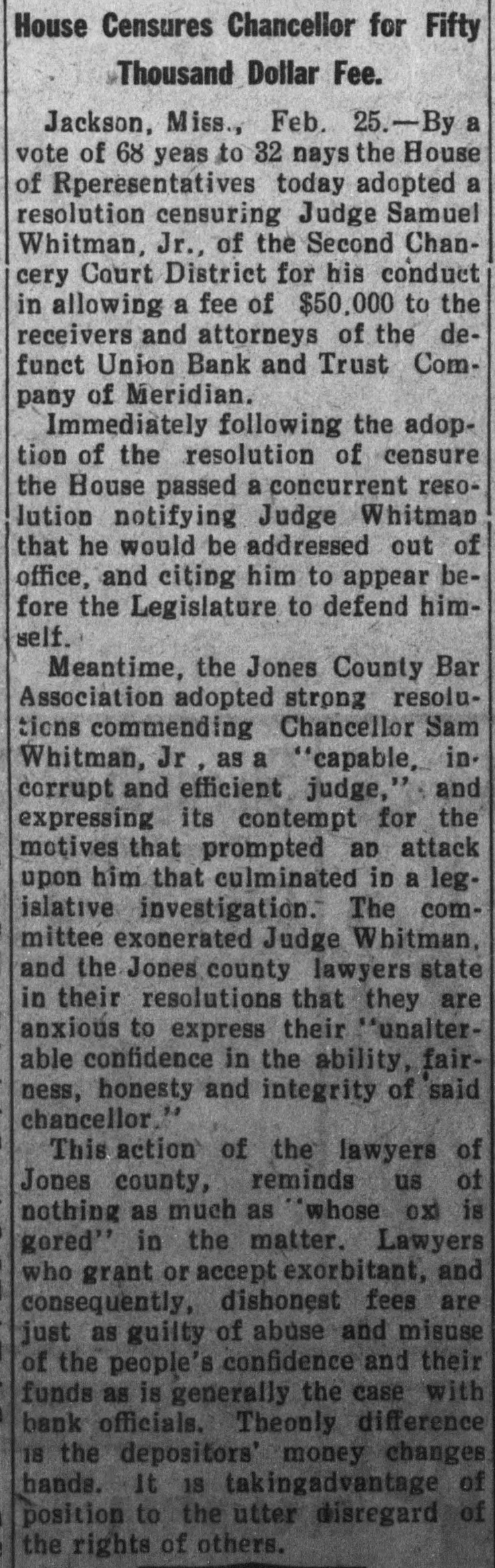 House Censures Chancellor for Fifty Thousand Dollar Fee. Jackson, Miss., Feb. 25. -By a vote of 68 yeas to 32 nays the House of Rperesentatives today adopted a resolution censuring Judge Samuel Whitman, Jr., of the Second Chancery Court District for his conduct in allowing a fee of $50.000 to the receivers and attorneys of the defunct Union Bank and Trust Company of Meridian. Immediately following the adoption of the resolution of censure the House passed a concurrent resolution notifying Judge Whitman that he would be addressed out of office, and citing him to appear before the Legislature to defend himself. Meantime, the Jones County Bar Association adopted strong resolutions commending Chancellor Sam Whitman, Jr as a "capable, in. corrupt and efficient judge," and expressing its contempt for the motives that prompted an attack upon him that culminated in a legislative investigation. The committee exonerated Judge Whitman, and the Jones county lawyers state in their resolutions that they are anxious to express their "unalterable confidence in the ability, fairness, honesty and integrity of said chancellor." " This action of the lawyers of Jones county, reminds us of nothing as much as whose ox is gored'' in the matter. Lawyers who grant or accept exorbitant, and consequently, dishonest fees are just as guilty of abuse and misuse of the people's confidence and their funds as is generally the case with bank officials. Theonly difference 18 the depositors' money changes hands. It 18 takingadvantage of position to the utter disregard of the rights of others.