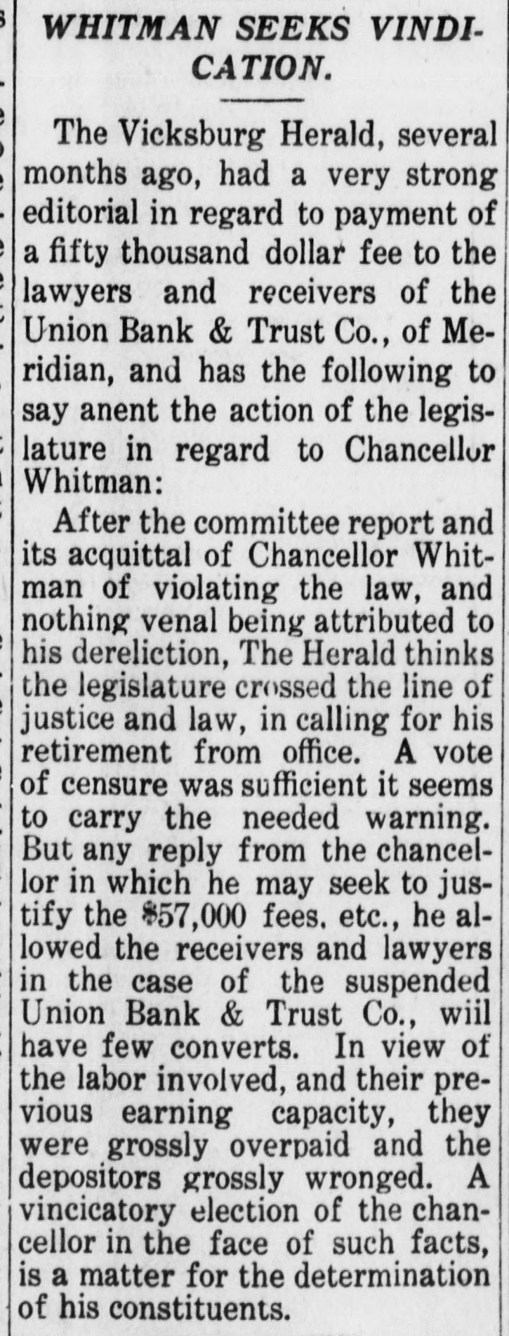 $ WHITMAN SEEKS VINDICATION. The Vicksburg Herald, several months ago, had a very strong editorial in regard to payment of a fifty thousand dollar fee to the lawyers and receivers of the Union Bank & Trust Co., of Meridian, and has the following to say anent the action of the legislature in regard to Chancellor Whitman: After the committee report and its acquittal of Chancellor Whitman of violating the law, and nothing venal being attributed to his dereliction, The Herald thinks the legislature crossed the line of justice and law, in calling for his retirement from office. A vote of censure was sufficient it seems to carry the needed warning. But any reply from the chancellor in which he may seek to justify the $57,000 fees. etc., he allowed the receivers and lawyers in the case of the suspended Union Bank & Trust Co., wiil have few converts. In view of the labor involved, and their previous earning capacity, they were grossly overpaid and the depositors grossly wronged. A vincicatory election of the chancellor in the face of such facts, is a matter for the determination of his constituents.
