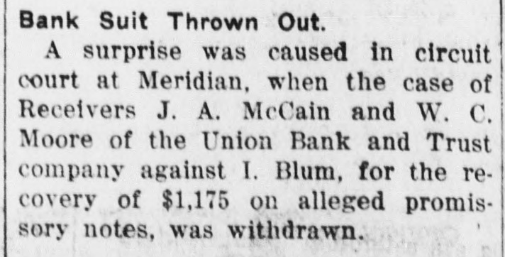 A surprise was caused in circuit court at Meridian, when the case of Receivers J. A. McCain and W. C. Moore of the Union Bank and Trust company against I. Blum, for the recovery of $1,175 on alleged promis-sory notes, was withdrawn.