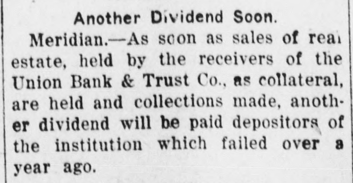 Meridian.—As soon as sales of real estate, held by the receivers of the Union Bank & Trust Co., as collateral, are held and collections made, another dividend will be paid depositors of the institution which failed over a year ago.