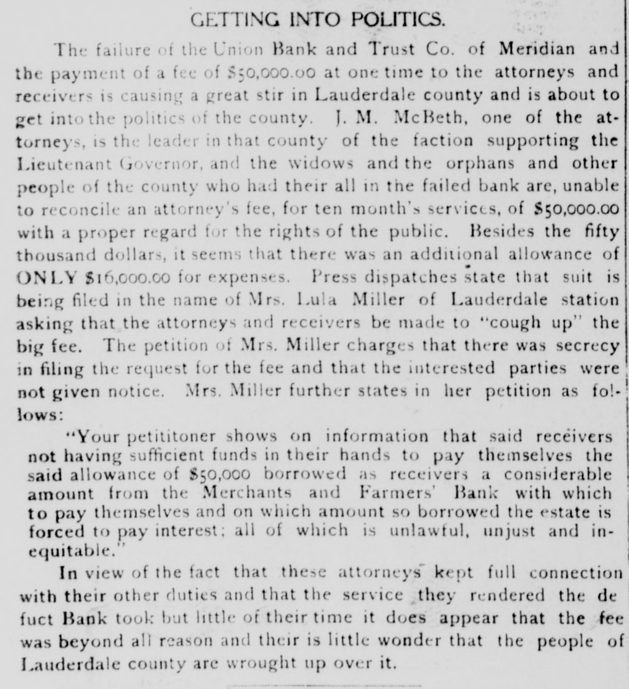 The failure of the Union Bank and Trust Co. of Meridian and the payment of a fee of $50,000.00 at one time to the attorneys and receivers is causing a great stir in Lauderdale county and is about to get into the politics of the county. J. M. McBeth, one of the attorneys, is the leader in that county of the faction supporting the Lieutenant Governor, and the widows and the orphans and other people of the county who had their all in the failed bank are, unable to reconcile an attorney's fee, for ten month's services, of $50,000.00 with a proper regard for the rights of the public. Besides the fifty thousand dollars, it seems that there was an additional allowance of ONLY $16,000.00 for expenses. Press dispatches state that suit is being filed in the name of Mrs. Lula Miller of Lauderdale station asking that the attorneys and receivers be made to "cough up" the big fee. The petition of Mrs. Miller charges that there was secrecy in filing the request for the fee and that the interested parties were not given notice. Mrs. Miller further states in her petition as follows: