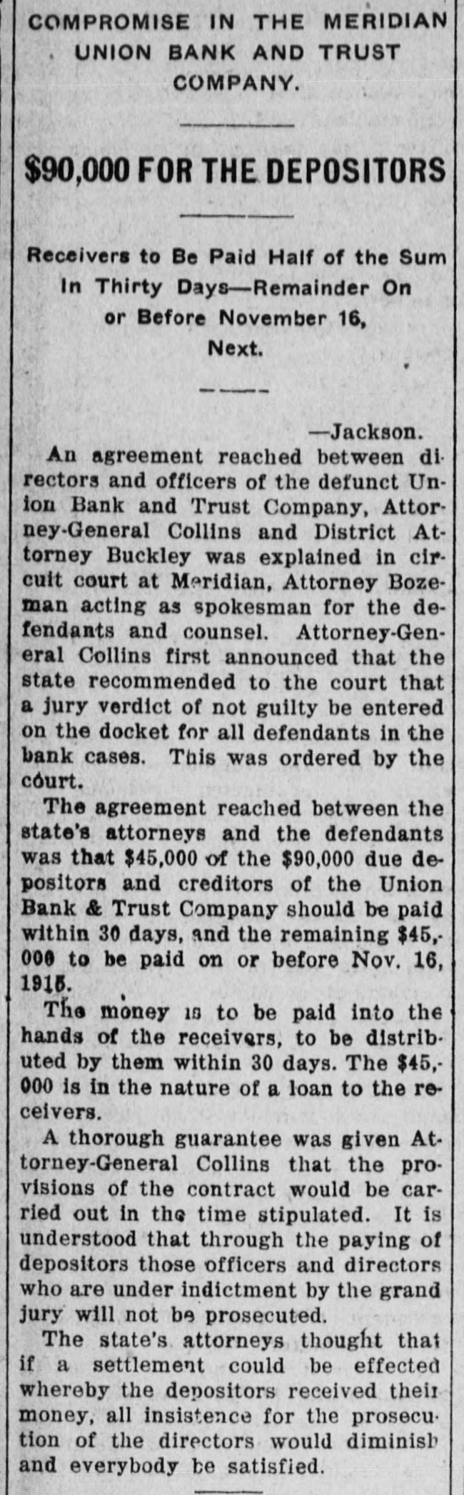 COMPROMISE IN THE MERIDIAN UNION BANK AND TRUST COMPANY. $90,000 FOR THE DEPOSITORS Receivers to Be Paid Half of the Sum In Thirty Days-Remainder On or Before November 16, Next. -Jackson. An agreement reached between directors and officers of the defunct Union Bank and Trust Company, Attorney-General Collins and District Attorney Buckley was explained in circuit court at Meridian, Attorney Bozeman acting as spokesman for the defendants and counsel. Attorney-General Collins first announced that the state recommended to the court that a jury verdict of not guilty be entered on the docket for all defendants in the bank cases. This was ordered by the court. The agreement reached between the state's attorneys and the defendants was that $45,000 of the $90,000 due depositors and creditors of the Union Bank & Trust Company should be paid within 30 days, and the remaining $45,000 to be paid on or before Nov. 16, 1915. The money 10 to be paid into the hands of the receivers, to be distributed by them within 30 days. The $45,000 is in the nature of a loan to the receivers. A thorough guarantee was given Attorney-General Collins that the provisions of the contract would be carried out in the time stipulated. It is understood that through the paying of depositors those officers and directors who are under indictment by the grand jury will not be prosecuted. The state's attorneys thought that if a settlement could be effected whereby the depositors received their money, all insistence for the prosecution of the directors would diminish and everybody be satisfied.