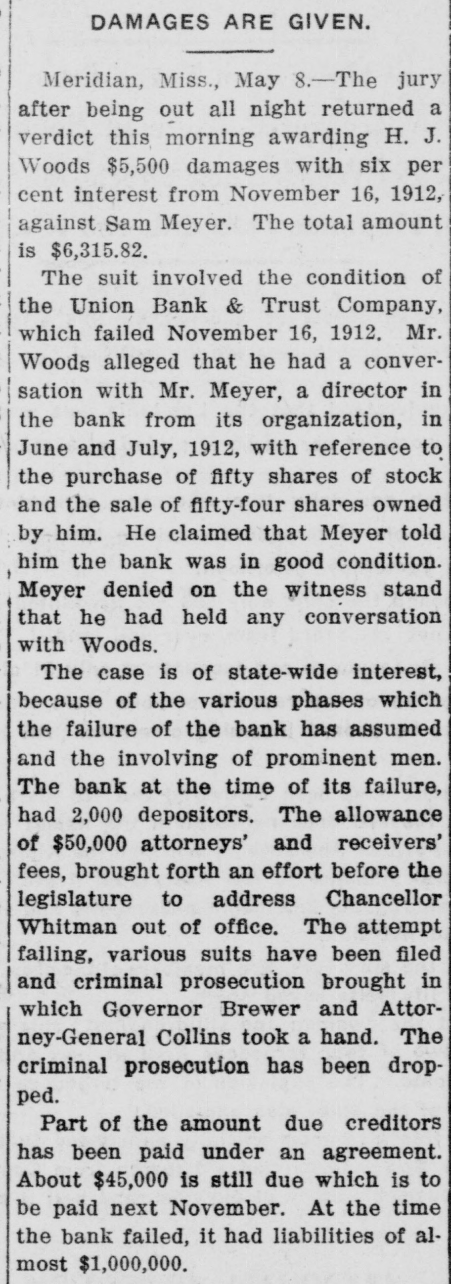 DAMAGES ARE GIVEN. Meridian, Miss., May 8.-The jury after being out all night returned a verdict this morning awarding H. J. Woods $5,500 damages with six per cent interest from November 16, 1912, against Sam Meyer. The total amount is $6,315.82. The suit involved the condition of the Union Bank & Trust Company, which failed November 16, 1912. Mr. Woods alleged that he had a conversation with Mr. Meyer, a director in the bank from its organization, in June and July, 1912, with reference to the purchase of fifty shares of stock and the sale of fifty-four shares owned by him. He claimed that Meyer told him the bank was in good condition. Meyer denied on the witness stand that he had held any conversation with Woods. The case is of state-wide interest, because of the various phases which the failure of the bank has assumed and the involving of prominent men. The bank at the time of its failure, had 2,000 depositors. The allowance of $50,000 attorneys' and receivers' fees, brought forth an effort before the legislature to address Chancellor Whitman out of office. The attempt failing, various suits have been filed and criminal prosecution brought in which Governor Brewer and Attorney-General Collins took a hand. The criminal prosecution has been dropped. Part of the amount due creditors has been paid under an agreement. About $45,000 is still due which is to be paid next November. At the time the bank failed, it had liabilities of almost $1,000,000.