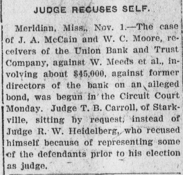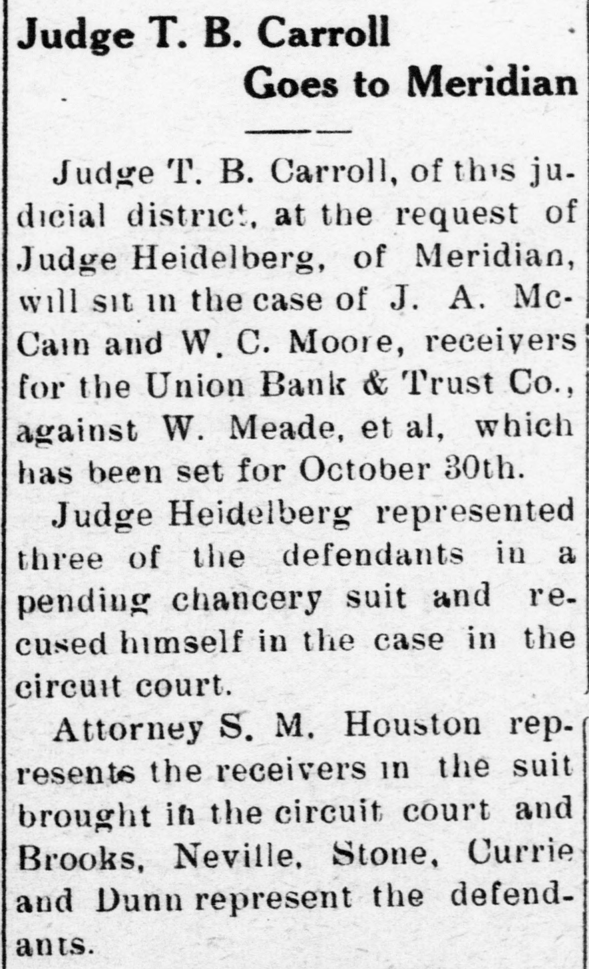 Judge T. B. Carroll Goes to Meridian Judge T. B. Carroll, of this judicial district. at the request of Judge Heidelberg, of Meridian, will sit in the case of J. A. McCan and W. C. Moore, receivers for the Union Bank & Trust Co., against W. Meade, et al, which has been set for October 30th. Judge Heidelberg represented three of the defendants in a pending chancery suit and recused himself in the case in the circuit court. Attorney S. M. Houston rep. resents the receivers in the suit brought in the circuit court and Brooks, Neville, Stone, Currie and Dunn represent the defendants.