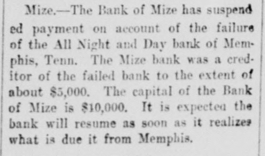 Mize.-The Bank of Mize has suspend ed payment on account of the failure of the All Night and Day bank of Memphis, Tenn. The Mize bank was a creditor of the failed bank to the extent of about $5,000. The capital of the Bank of Mize is $10,000. It is expected the bank will resume as soon as it realizes what is due it from Memphis.