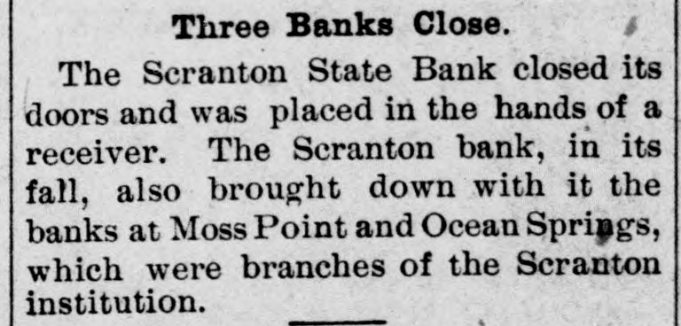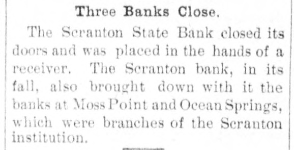 Three Banks Close. The Scranton State Bank closed its doors and was placed in the hands of a receiver. The Scranton bank, in its fall, also brought down with it the banks at Moss Point and Ocean Springs, which were branches of the Scranton institution.